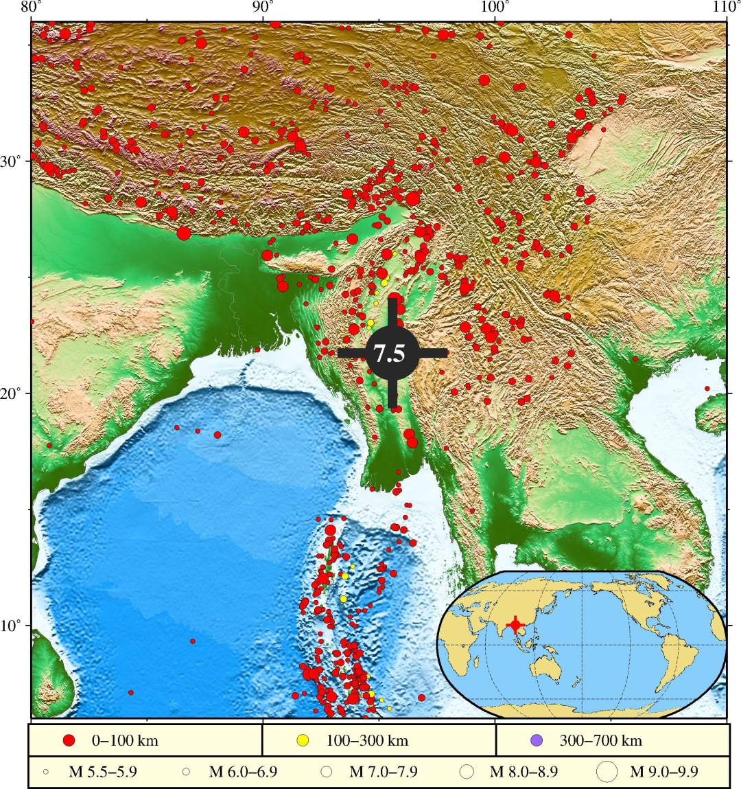 缅甸弧地区位于喜马拉雅造山带的东构造结,地壳构造变形强烈且地震活动性强,形成一系列南北走向的构造单元和断层,是喜马拉雅地震带上地震最活跃的地区之一。1900年以来,震中附近300公里范围内共发生7级以上地震10次,最大为1912年5月23日缅甸境内的8.0级地震。