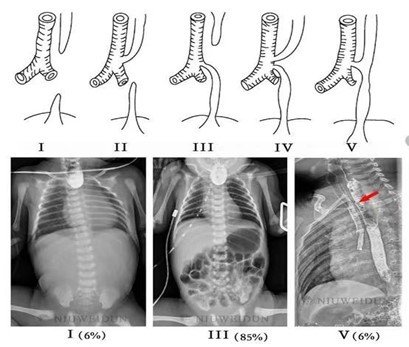 根据食管闭锁的部位以及是否并有食管气管瘘,先天性食管闭锁可分为五种类型。孩子可表现为唾液不能下咽,从而反流入口腔,导致新生儿出生后即出现流涎、吐白沫等症状。由于食道闭锁,乳汁无法正常进入胃内,会溢流入呼吸道,引起呛咳、呕吐,并且会出现呼吸困难和发绀(口唇、指甲青紫)等现象。胃液经食管气管瘘反流入呼吸道,容易引发吸入性肺炎,导致肺部感染。