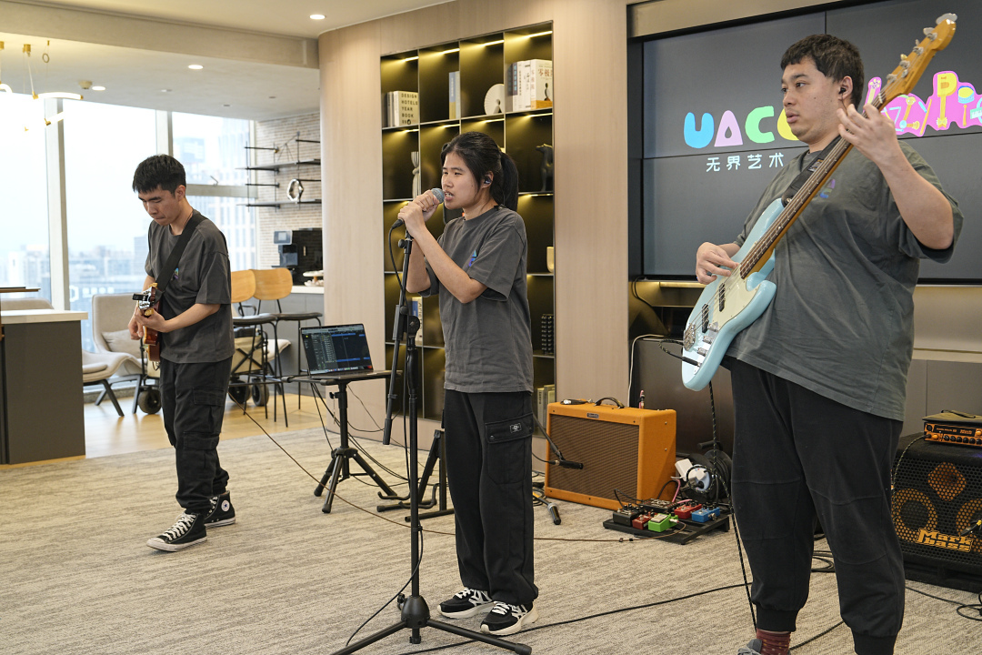 苹果高管一行人还走进了融合乐队Jazzy Pie工作室进行参观,深入了解了Apple辅助功能如何让特殊人群更好地享受科技带来的便利与乐趣。乐队主唱的谢铉岚(岚岚),是早产视网膜病变造成了视力障碍,音乐是她生命的重要组成部分,音乐让她开心、自信,是她和外界沟通的渠道之一。岚岚日常的生活和排练离不开iPhone,其中的旁白、读屏、图像识别等辅助功能她需要常常用到。例如平常排练,乐队负责人、导师Demon老师会把乐谱发给岚岚,她会借助旁白等功能熟悉歌词乐曲,效率非常高,展现了科技赋能艺术的无限可能。