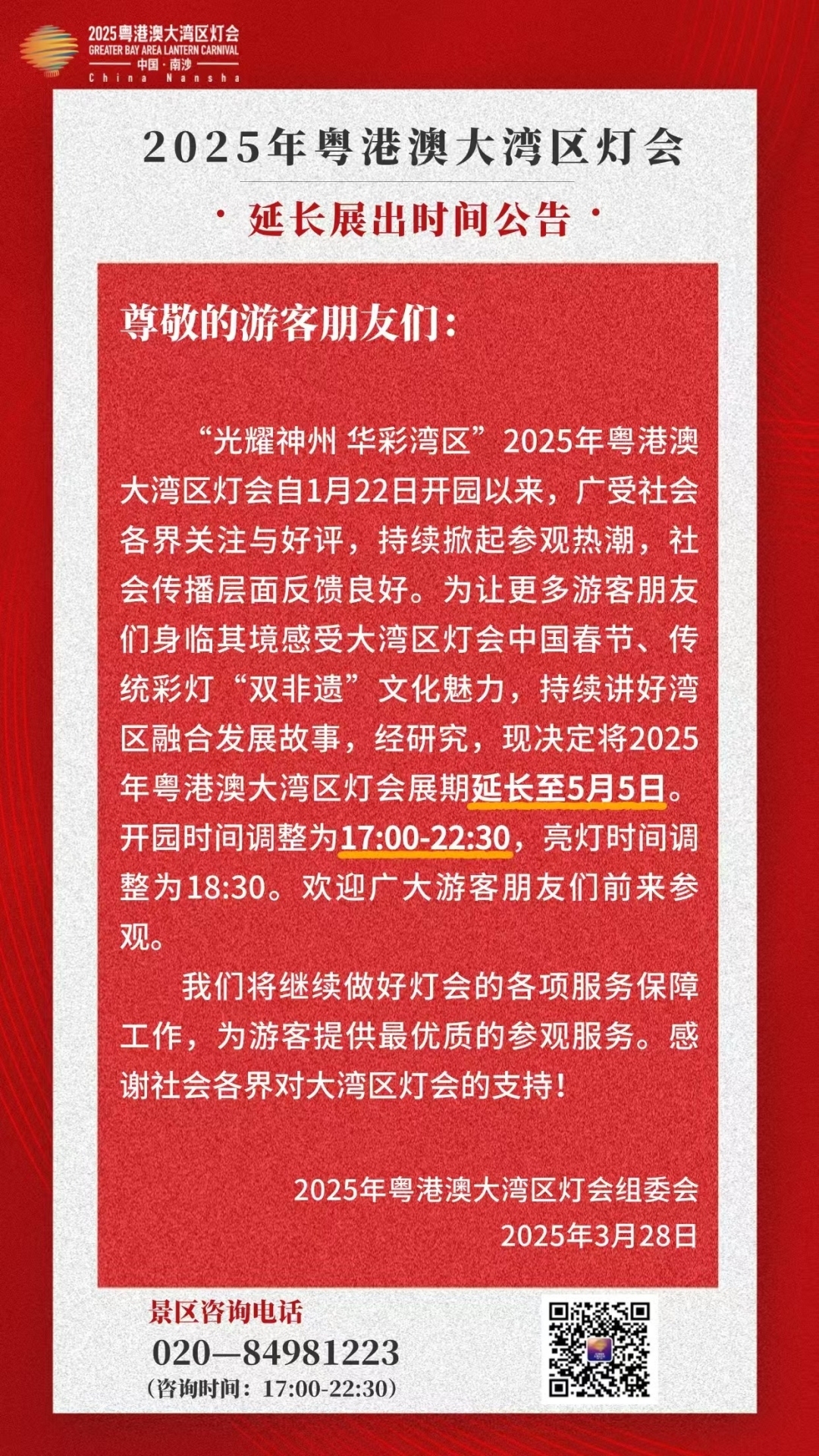 2025粤港澳大湾区灯会组委会发布《关于粤港澳大湾区灯会延展的公告》,灯会展期将延长到5月5日。