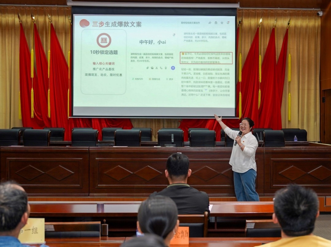 培训采用“专业教师理论授课+学生助理实操指导”双轨教学模式,大迈国际电子商务(广州)有限公司总经理黎健德带来《AI商业应用》主题分享,生动展示了AI+电商带来的高效生产力。广州市轻工技师学院袁晓燕、毛尔佳老师则以《AI破局——手机就是新农具》为主题,通过“三步10秒生成爆款文案”“剪映一键AI成片”“5秒完播的黄金开头”等实操教学,13名学生助理同步开展分组实操指导,确保学员“即学即练、随问随答”。让学员快速掌握“智能工具+本土产品”的电商新技能。