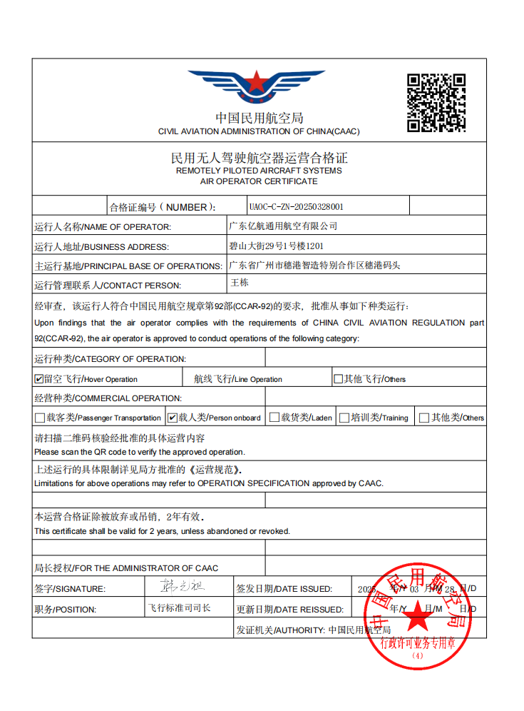 3月28日,广州企业亿航智能旗下全资子公司广东亿航通用航空有限公司(下文简称“亿航通航”)收到了由中国民航局颁发的全球第一张民用无人驾驶航空器运营合格证(OC)。这意味着中国低空经济“载人时代”序章正式开启。