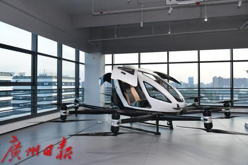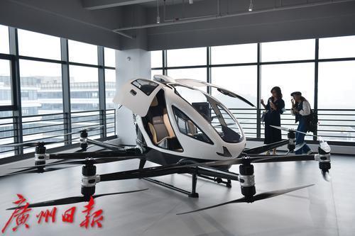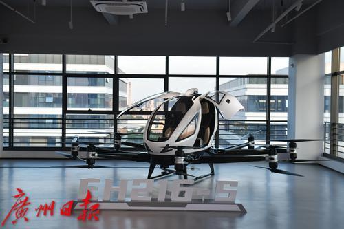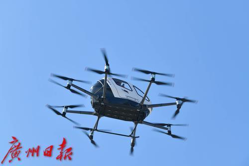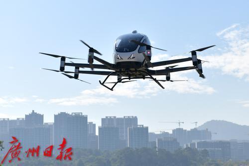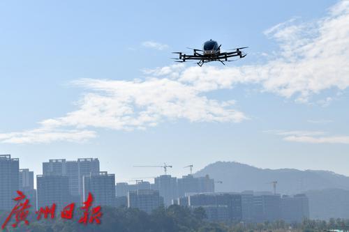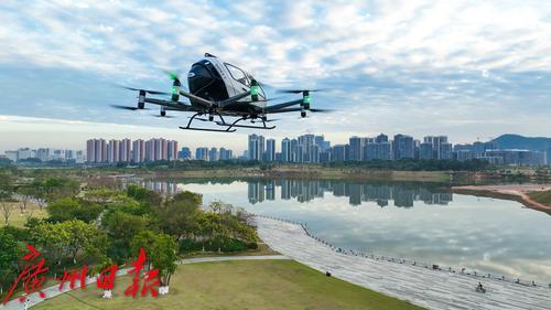 亿航无人驾驶载人航空器在中新广州知识城九龙湖广场上空飞行。