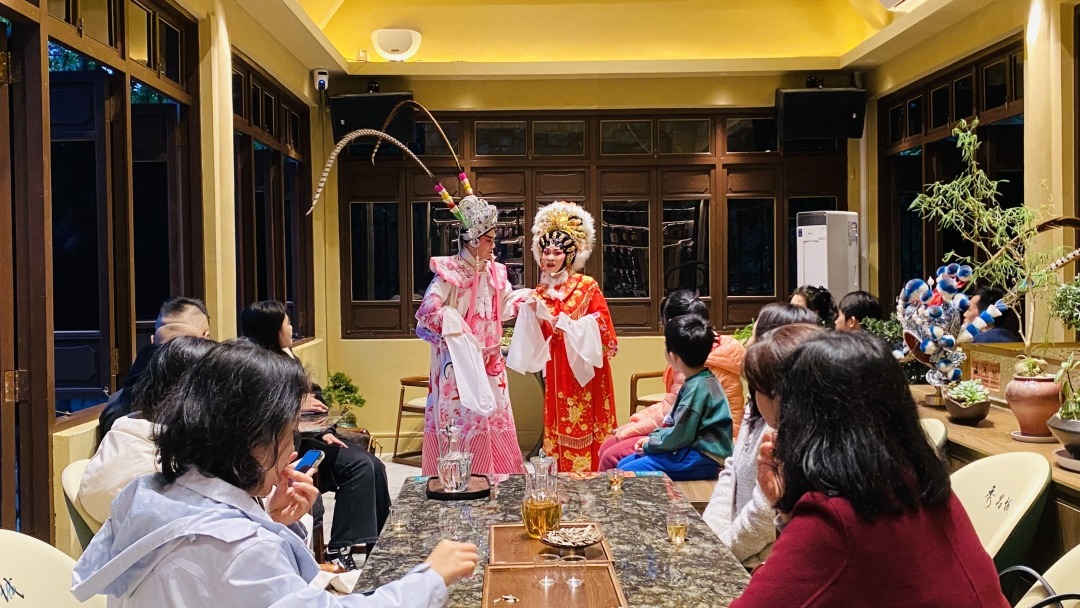 夜色渐浓,越秀公园东门城楼的飞檐翘角在灯光中勾勒出金色轮廓,古色古香的建筑在暖黄灯光的映衬下更显庄重典雅。每周六、周日18时30分,“粤剧盛宴城楼之夜”活动在此准时开演,来自广州粤剧院的演员们身着华丽戏服,为游客带来精彩纷呈的粤剧演出。水袖轻拂间,百年粤韵与现代茶饮吧台碰撞出别样火花,非遗粤剧与广府茶文化交织成新的文化叙事。一曲《狄青闯三关》《七月七日长生殿》,一杯清茶,只需静静观赏与聆听,便不负这良辰美景。