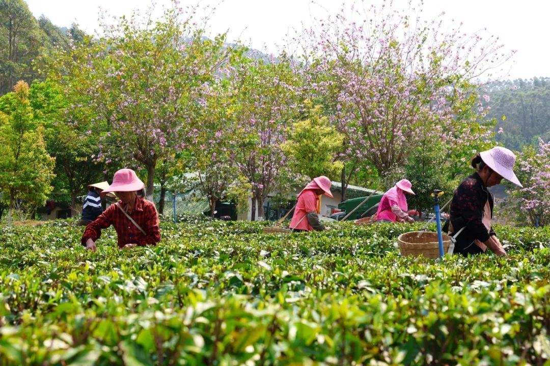 3月25日上午10时许,茶山内已有近二十位村民穿梭其中采摘春茶。据了解,除了有十名本地群众,还有来自附近村子的村民,茶园包吃、包接送,手脚勤快的村民一上午可获得超百元收入。来自附近村子的一位阿姨笑着说道,“早上五六点就过来了,采茶比耕田种地轻松,时间灵活,还能照顾家里。”据统计,茶园长期雇佣两名村民打理茶树,每年累计为周边村民提供季节性用工超100人次。