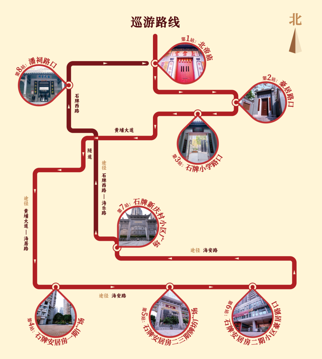 1. 北帝庙——2. 豪居路口——3. 石牌小学路口——4. 石牌安居房一期广场——5. 石牌安居房二三期牌坊广场——6. 石牌安居房二期小区豪居路口——7. 石牌新庆村小区广场——8. 潘祠路口