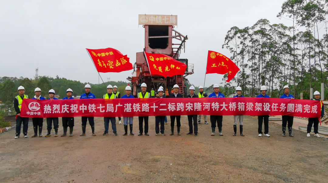 据悉,由广东铁投集团所属广湛铁路公司投资建设、中国铁路设计集团EPC总承包、中铁七局承建的广湛十二标跨宋隆河特大桥横跨肇庆市高要区回龙镇和蛟塘镇,桥梁全长约8.9公里,包含连续梁4座、桩基1225根、承台136个、墩身151个、箱梁架设221孔,是广湛铁路机场段建设体量最大、长度最长的桥梁,为项目重点控制性工程。