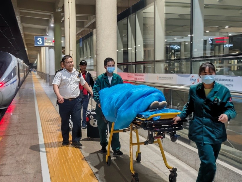 “立即启动重点旅客应急预案!”得知情况的彭凯立即汇报车站,车站高度重视,迅速与上级部门沟通协调,一场与时间赛跑的紧急联动全面展开。彭凯和同事一方面联系急救中心确认伤情,锁定平卧转运方案,确认担架固定装置参数;另一方面与上级部门紧急沟通,优化流程,同时联系旅客确认相关流程。
