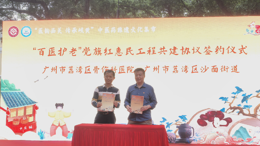 启动仪式上,荔湾区骨伤科医院院长孙振全致辞。他表示,西关正骨作为岭南医学的瑰宝,具有深厚的文化底蕴和独特的医学价值,希望通过此次活动让市民在“家门口”就能体验到中医药文化的博大精深和西关正骨非遗代表性项目的魅力。随后,广州市荔湾区骨伤科医院与沙面街道签署“百医护老”党旗红惠民工程共建协议,标志着双方将以党建为引领,推动优质医疗资源下沉社区,定期开展上门探访、义诊便民、健康讲座等服务,为社区老年人送去温暖和关怀。