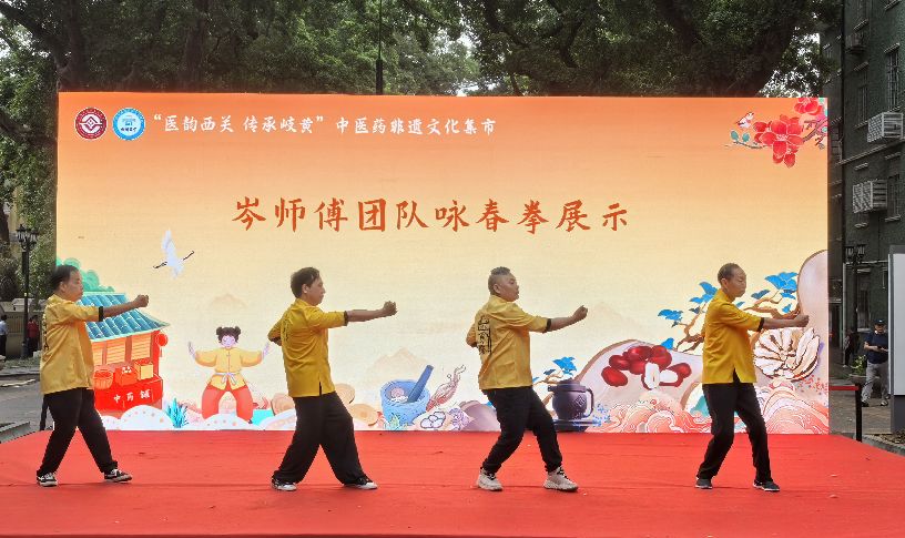 随后,广州市非物质文化遗产咏春拳代表性传承人岑兆伟带领弟子们带来精彩的咏春拳表演,点燃全场氛围。西关正骨武术队演绎独创的“骨正筋柔功”,展现了传统武术与中医养生理念的融合,吸引不少市民现场跟练。有市民表示,练完后全身都放松了不少。