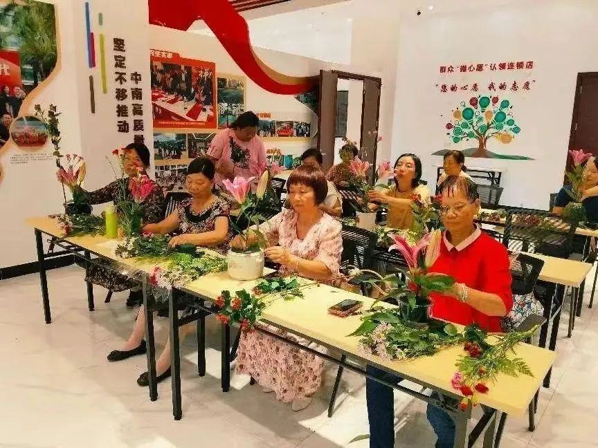 针对社区的老年群体,党群服务中心打造了“家门口”的红色学堂,依托“1+6+N”党群服务阵地,整合辖区“绿美生态”、健康与生活、非遗文化等资源,组织辖内社区和共建单位,开展绿美荔湾摄影、医疗健康、水墨书法、插花与生活美学、广府茶艺等系列课程。