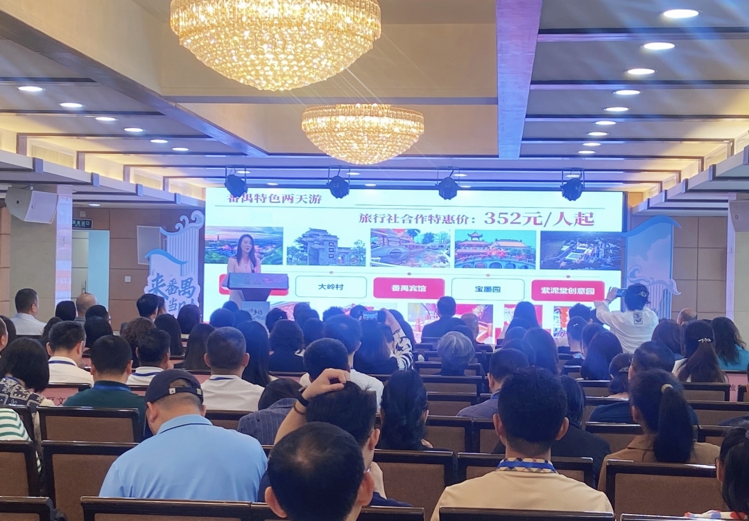 在文旅资源推介环节,番禺全域旅游宣传大使生动展示了番禺深厚的历史文化底蕴、丰富文旅资源及特色旅游线路。来自余荫山房、番禺区健康管理中心、沙湾古镇、珠江文体和番发集团等5名旅游行业代表分别向现场旅游企业推介番禺康养游、乡村游、研学游等特色旅游产品,并推出多重优惠,吸引旅行社参与推动景区、民宿、餐饮联动发展,共同开发番禺“古村+非遗+体育+美食”的特色旅游线路。
