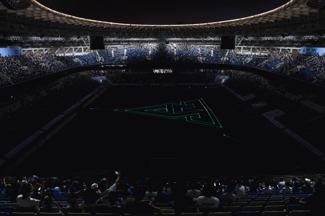 当晚,体育展示团队在体育场四周穹顶架设12台激光设备,以足球场内场为画卷,以城市脉搏、铁血传承、鹏城之翼、无限进取四个序章,进行为时4分16秒,充满科技感的激光表演,向全场观众展示深圳的城市风貌、足球运动发展、深圳体育中心体育场的焕新归来和新鹏城俱乐部的落户。