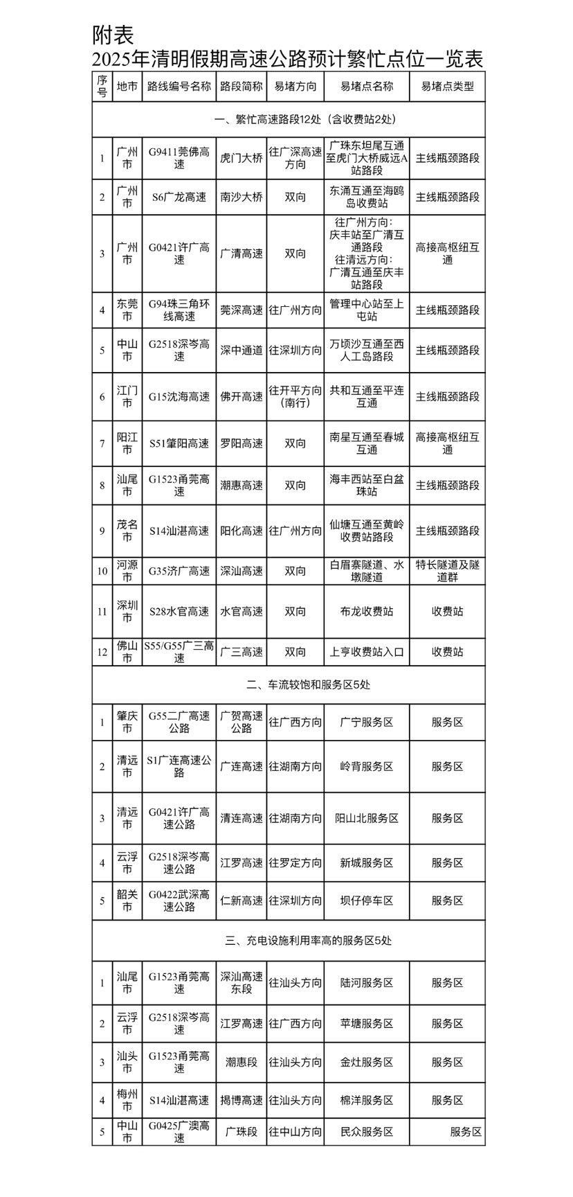 经与广东省公安厅交管局联合研判,今年广东清明假期期间较为拥堵的路段、收费站、车流较饱和服务区以及充电设施利用率高的服务区详见附表。今年清明假期,全省交通运输部门积极会同各方,提前研判,周密部署,合力保障公路运行安全畅通有序。