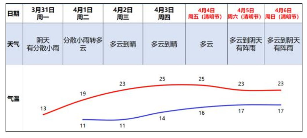 3月31日,市防汛防旱防风总指挥部办公室与市气象局对广州未来七天的气象水文情况进行了会商。会商结论意见指出,预计,本周广州以阴天和多云天气为主,周末有阵雨。3月31日阴雨寒冷天气维持,气温介于9~13°C;4月1日白天起转多云天气,气温开始回升;4月2日至4日,多云到晴为主,气温继续回升,昼夜温差加大;4月5日起,受弱冷空气影响,多云到阴天,有阵雨,气温小幅波动。