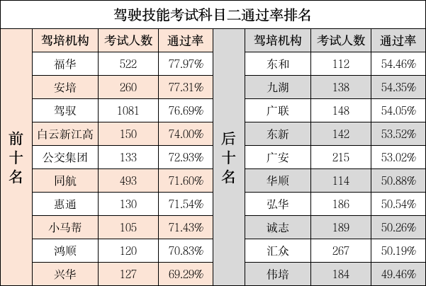 在考试通过率方面,2025年2月,广州市场地驾驶技能考试(科目二)通过率最高的机构的通过率为77.97%,通过率最低的机构的通过率为49.46%;广州道路驾驶技能考试(科目三)通过率最高的机构的通过率为73.98%,通过率最低的机构的通过率为43.04%(前后十名,考试人数小于100人的驾培机构不纳入统计)。
