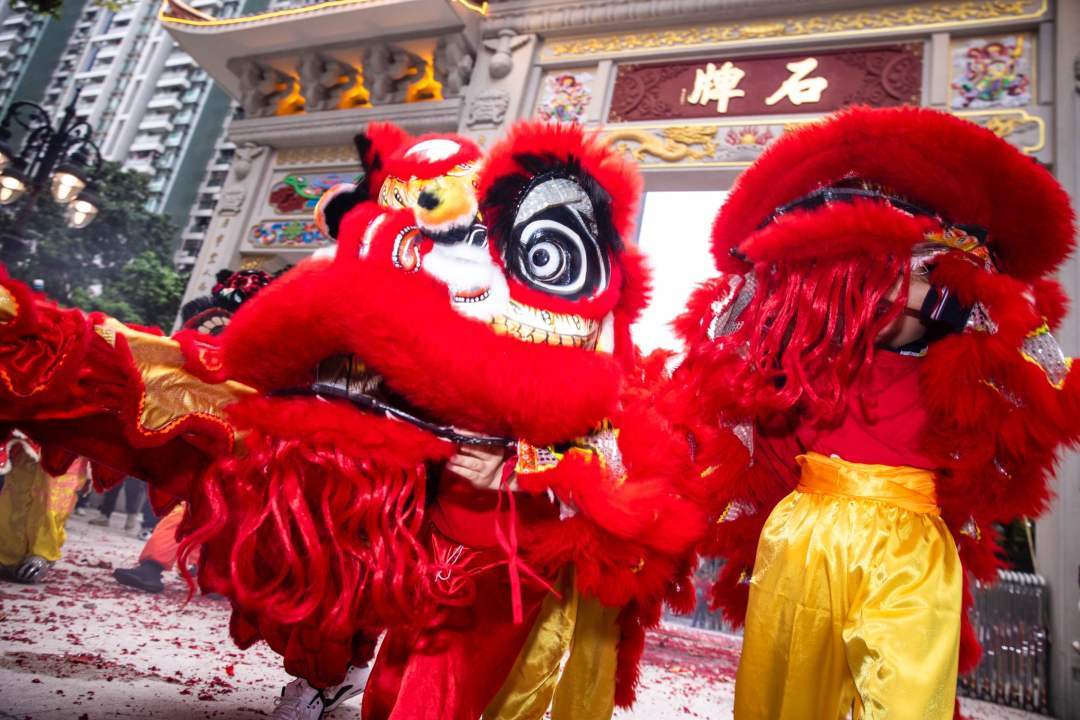 “重头戏”北帝诞巡游活动在上午8时拉开帷幕。北帝庙前,石牌村四支醒狮队热闹采青纳福。随后,一声锣声响起,巡游队伍浩浩荡荡地出发游村。