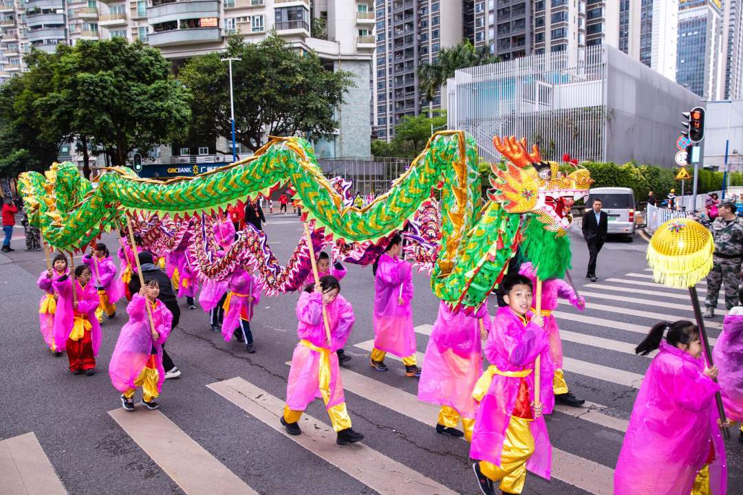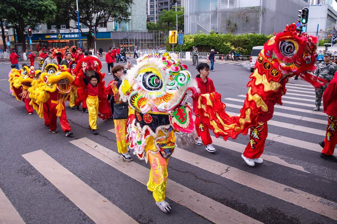 一路上,由石牌小学学生组成的“少年龙狮传承方阵”惹人注目。当天不时飘来细微的春雨,少年龙狮队员们都披上了薄薄的一层雨衣,但难掩内里鲜艳的龙狮服,以及朝气蓬勃的精神。长龙在空中舞动,栩栩如生;小狮子们摇头摆尾,威武灵动……