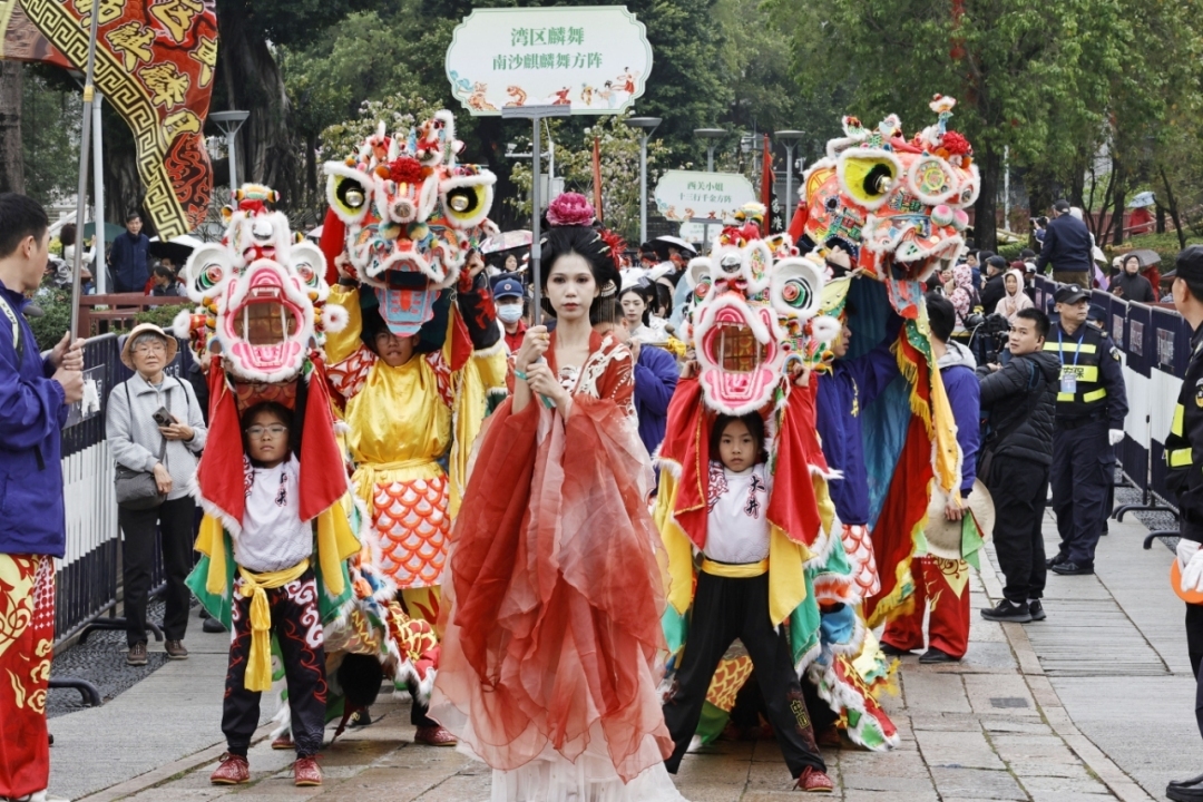 打头阵的依然是由泮塘村民率领的龙狮献瑞方阵,泮塘村一直致力于传承、推广醒狮、扒龙船、醒狮等民俗文化,至今生生不息。村内有以狮会友的传统,每逢重大节庆,村民都会敲响锣鼓,舞起龙狮来庆祝,通过各种创新方式让广东醒狮更年轻、更新潮,更有魅力。