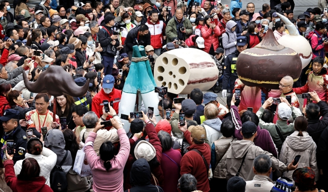 去年大受欢迎的泮塘五秀方阵今年再度出游,巨型五秀可爱鬼马的独特造型,深受市民游客的喜爱与追捧,成为当天的一道亮丽风景,无愧“食在广州”这个美誉。泮塘五秀指广州荔湾泮塘地区自古种植的五种水生作物——菱角、莲藕、马蹄(荸荠)、茭笋(茭白)、慈姑(茨菇),其历史可追溯至宋代。依托珠三角水网密布的生态条件,这五类作物不仅是古代泮塘村民赖以为生的经济支柱,更衍生出马蹄糕、莲藕糖等岭南特色美食,并融入端午祭水神、中秋食藕饼等民俗,成为西关水乡文化的地标符号,至今仍以非遗身份延续着“水生为秀,沃土成珍”的农耕智慧。