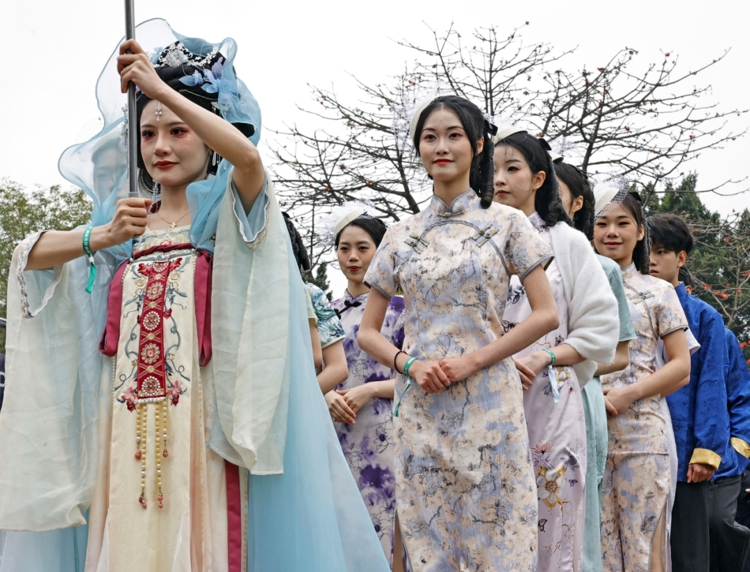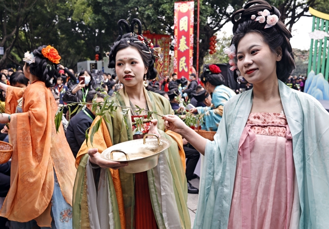 随后,“三月三,临水祓禊”,10多位汉服佳人从文塔祈福归来,依古礼行“祓禊礼”,为现场嘉宾以兰草净水洗去尘埃,重现古时祓禊场景。