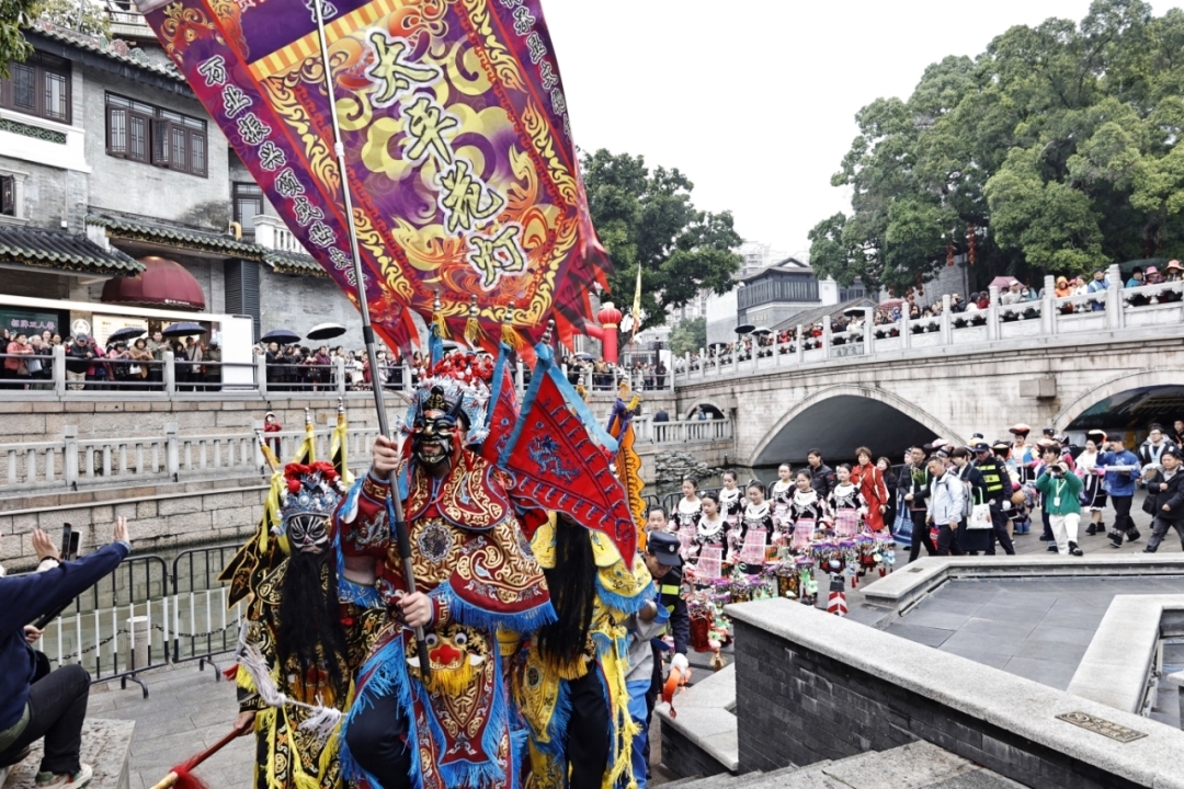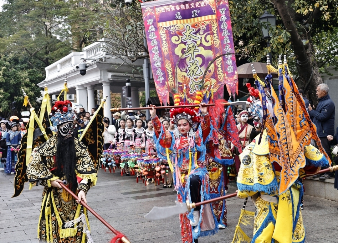 此外,巡游还邀请来自远方的客人,来自贵州惠水和龙里的苗族、布依族同胞们向现场的市民游客展示了贵州少数民族的非遗技艺与浓浓的烟火气,展现了独特的民族文化和热情好客的精神风貌。龙里县太平花灯起源于明代,随汉族移民传入贵州,后在龙里地区与当地少数民族文化交融,逐渐形成独特风格,通过表演祈求风调雨顺、家庭平安。惠水县苗族同胞们手捧惠水特产、布依族拿着本地非遗枫香染巡游,展现他们的智慧和对美好生活的向往。
