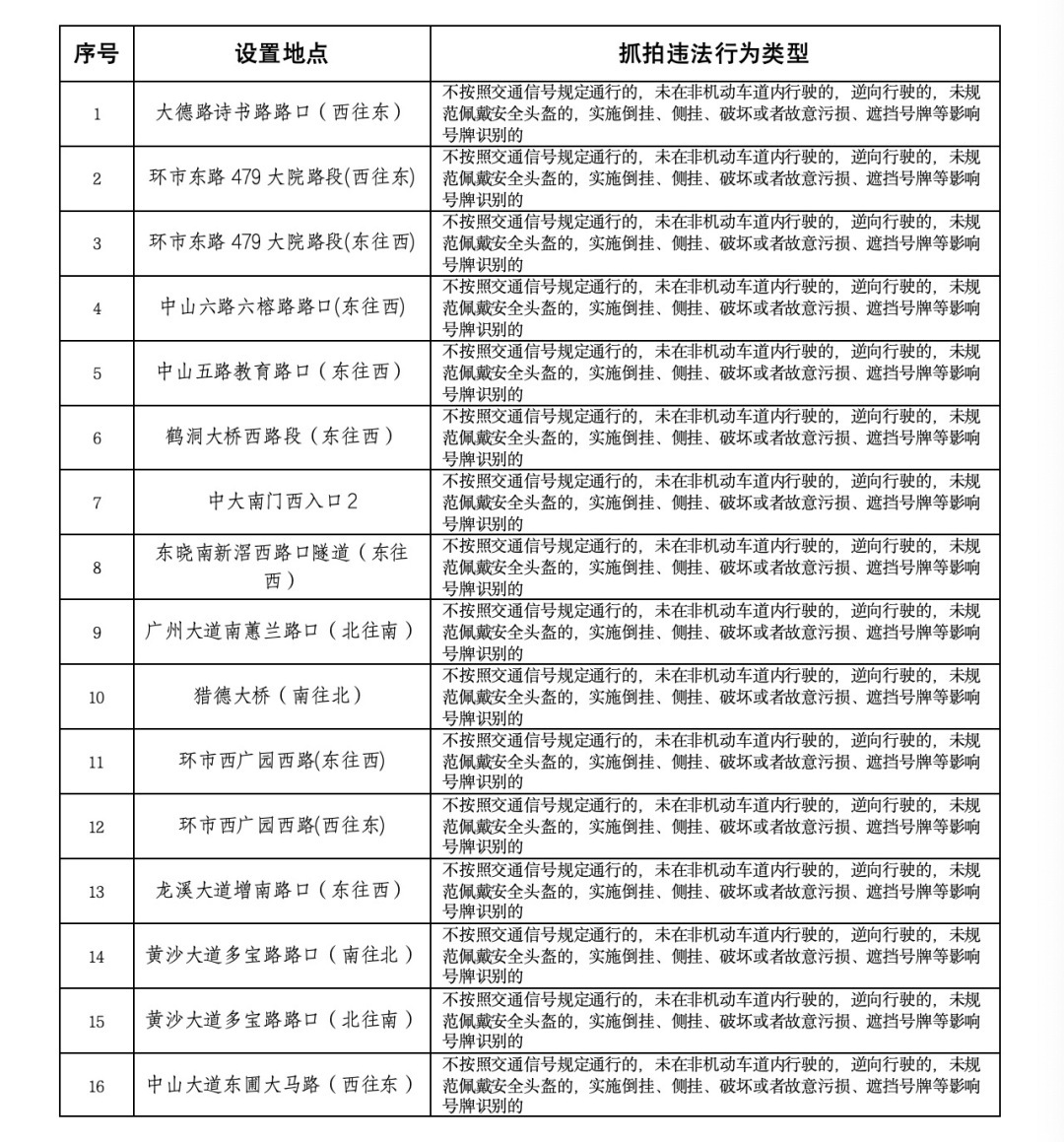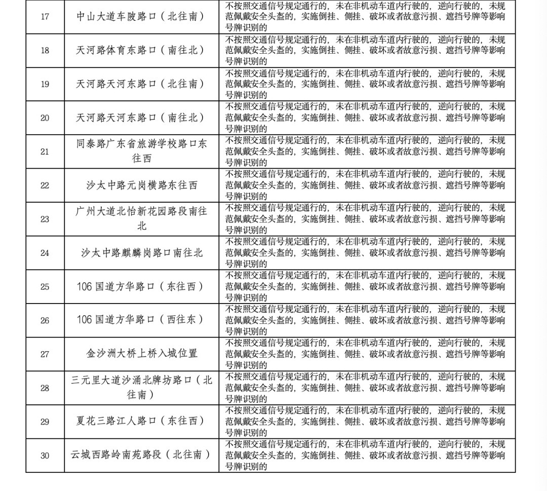记者3月31日从广州市公安交警部门获悉,广州交警将对以下30个电动自行车交通违法行为抓拍取证点位,在原有抓拍违法行为类型的基础上,新增对电动自行车驾驶人、乘坐人未规范佩戴安全头盔等交通违法行为进行抓拍取证,并短信告知违法当事人配合调查处理。