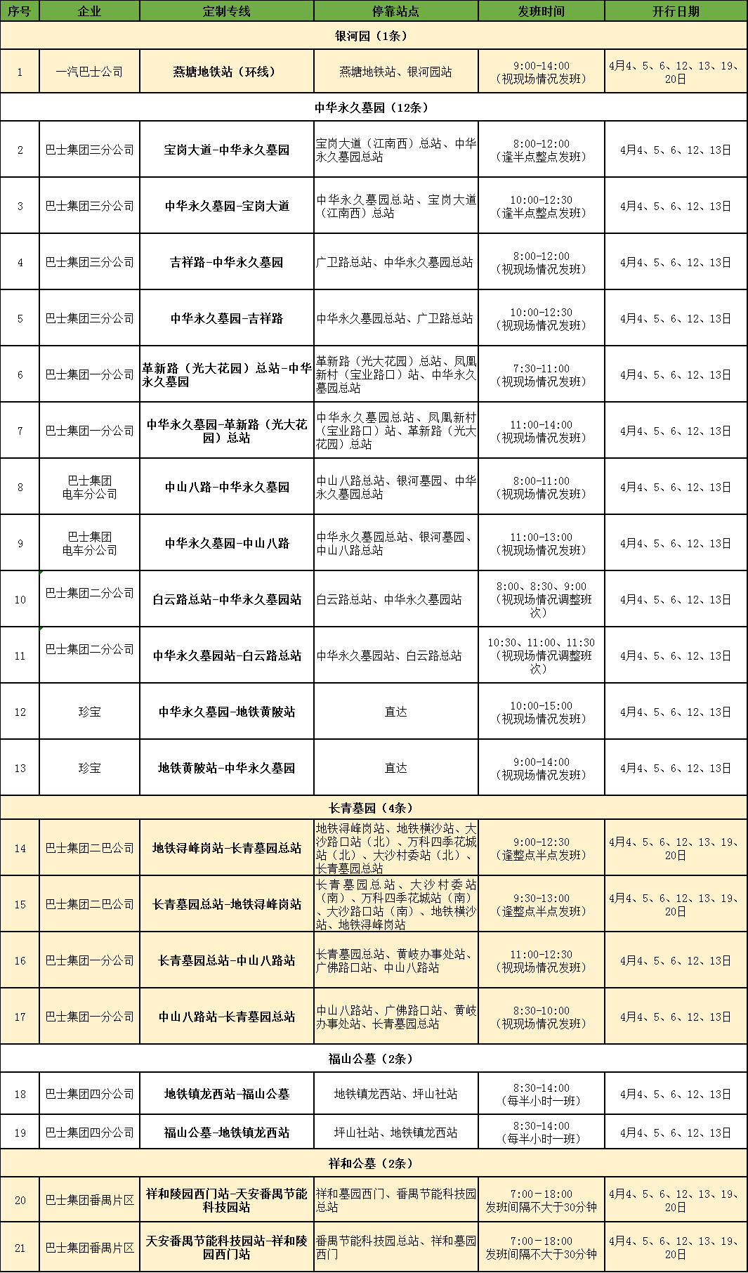 3月31日,记者了解到,为方便市民在清明祭扫期间公交出行,广州市交通运输部门组织各公交企业在清明假期及随后两个周末(4月4、5、6、12、13、19、20日),开设21条往返市内各主要墓园的定制公交专线。