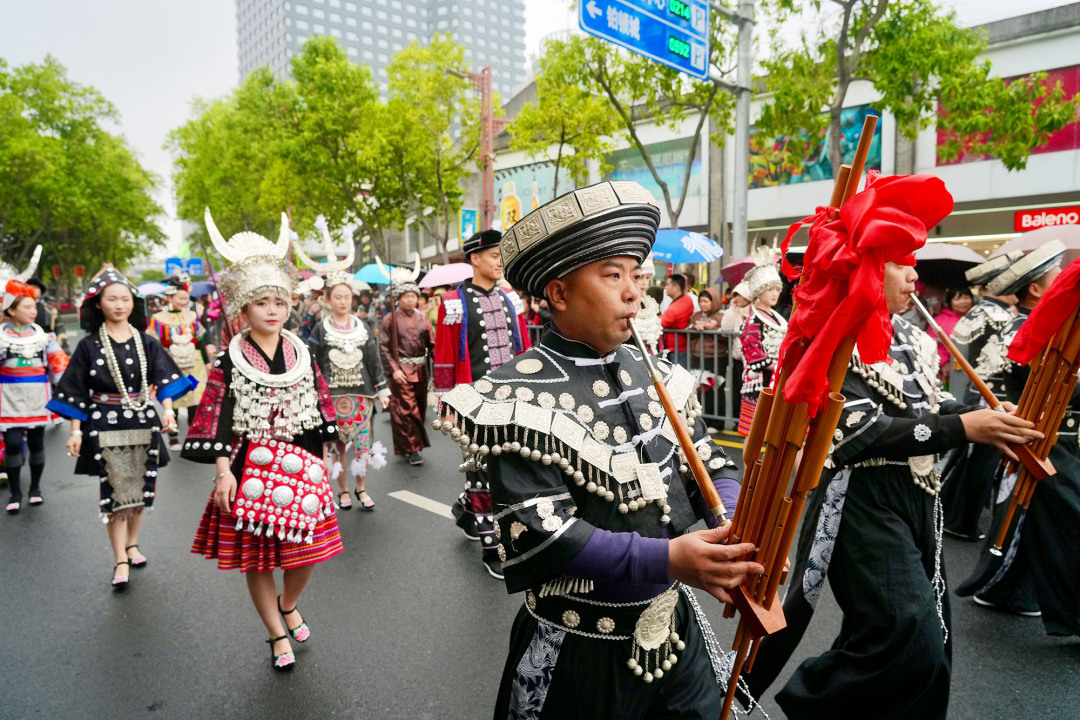 3月31日上午10时,众人期待的非遗巡游正式开始。今年非遗巡游共有11大方阵参与,包含国家级非遗顺德人龙舞、省级非遗沙湾飘色等岭南特色传统元素,又兼具黔东南州“苗山侗水”等佛山对口帮扶地区地域特色民族文化。其中,黔东南州的特色民族文化方阵是焦点,以绚丽服饰、动感舞姿与独特乐韵,呈现黔东南多彩民族文化,彰显中华民族团结共融的时代风采。