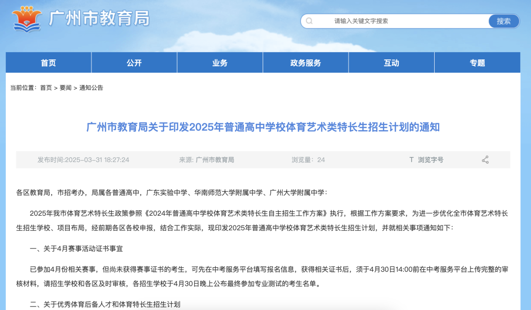 今年的特长生招生政策有变化吗?广州市教育局表示,2025年特长生招生政策和2024年基本保持一致。