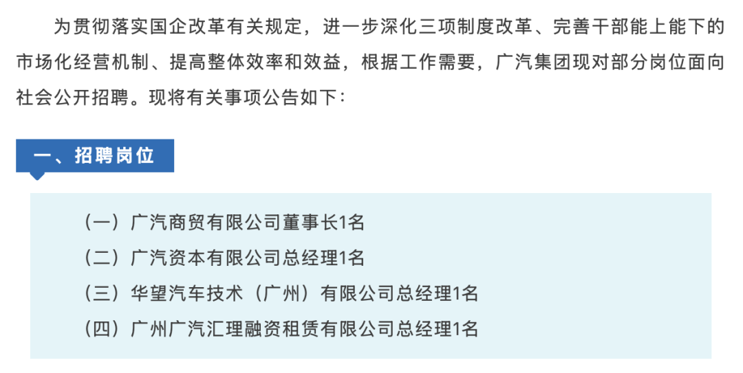 记者了解到,招聘岗位总共有四个,分别为广汽商贸有限公司董事长、广汽资本有限公司总经理、华望汽车技术(广州)有限公司总经理、广州广汽汇理融资租赁有限公司总经理。