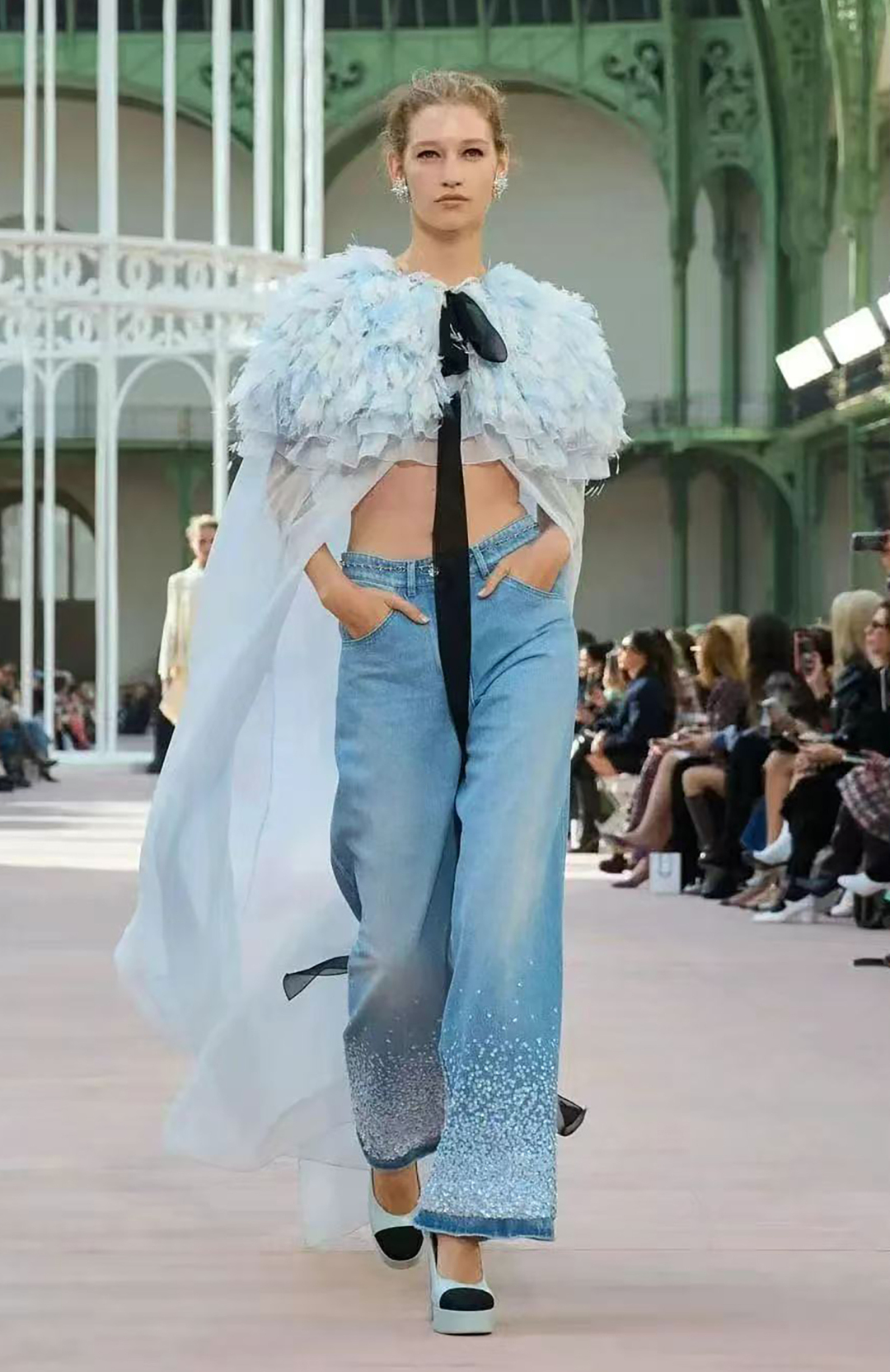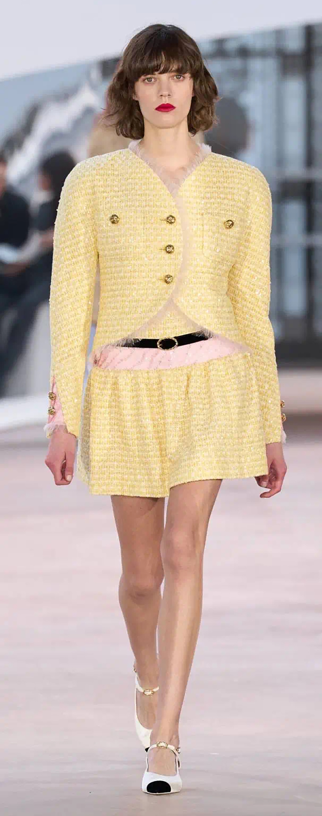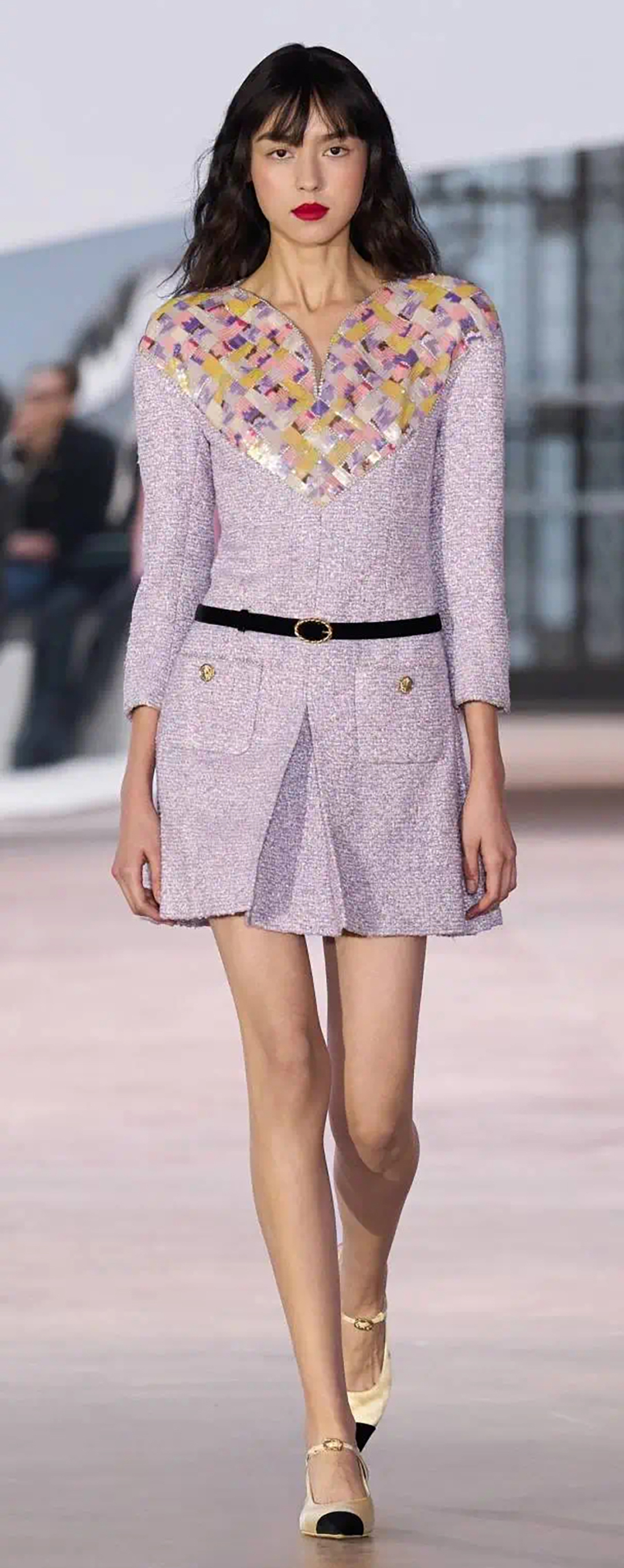 “比如香奈儿在2025春夏系列中大量采用了春夏季节常见的明亮颜色,包括嫩绿色、柔粉色和日光黄等,让人感受到春天的生机和活力。”邓颖举例表示,轻盈的雪纺面料、若隐若现的开衩设计以及精致的羽毛装饰,不仅营造出春日轻盈感,还塑造“毫不费力”的氛围感。在她看来,彩色为主题的穿衣风格,穿搭时可以多利用款式上设计好的小细节。邓颖建议可尝试加入一些中性色进行搭配,“比如一件白色T恤或衬衫,它作为内搭可以中和‘浅春系’带来的甜美度。”
