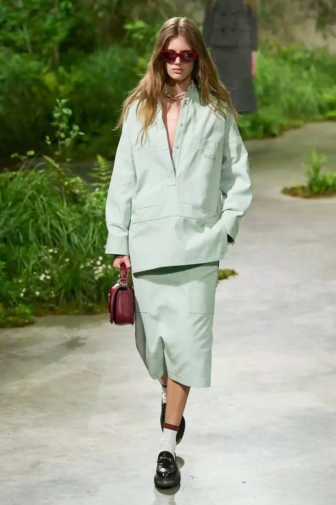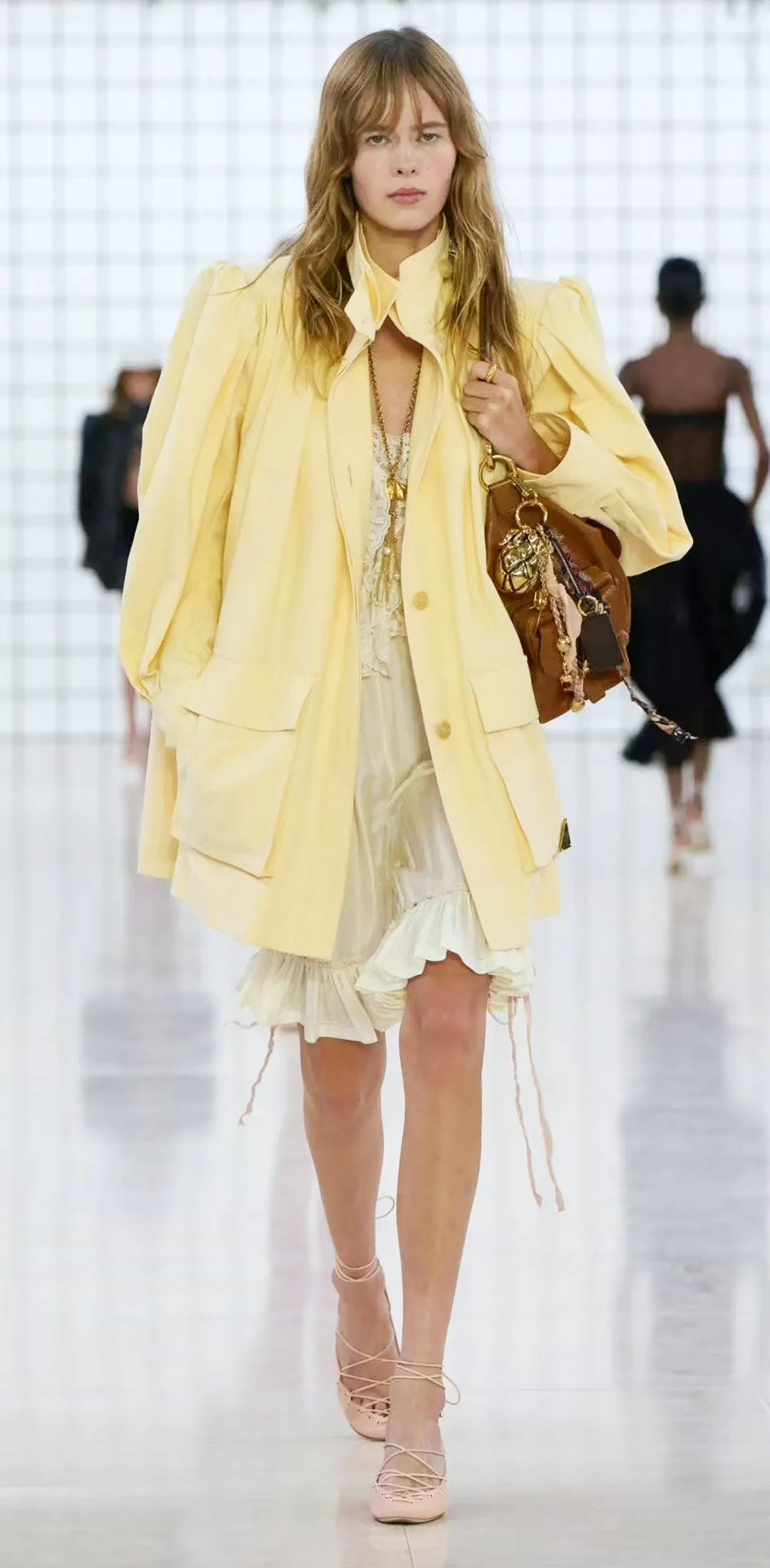 热爱松弛感的“95后”设计师希尔认为,当下时髦的年轻人喜欢的穿搭是既“百花齐放”又“毫不费力”的多样性与独特性。今年秀场设计上,领口开衩、荷叶边袖、不对称下摆等元素在Gucci、Chloé秀场中随处可见,服装设计着重展现了姿态各异的“包容感”。