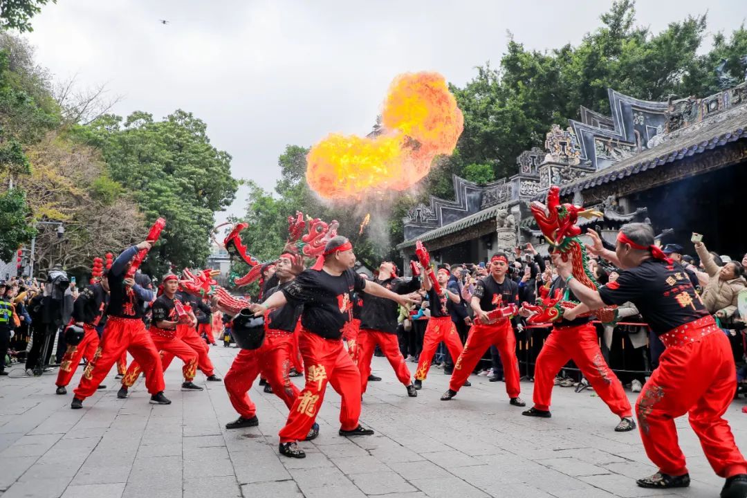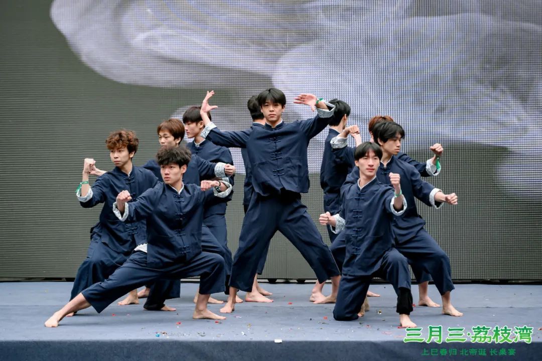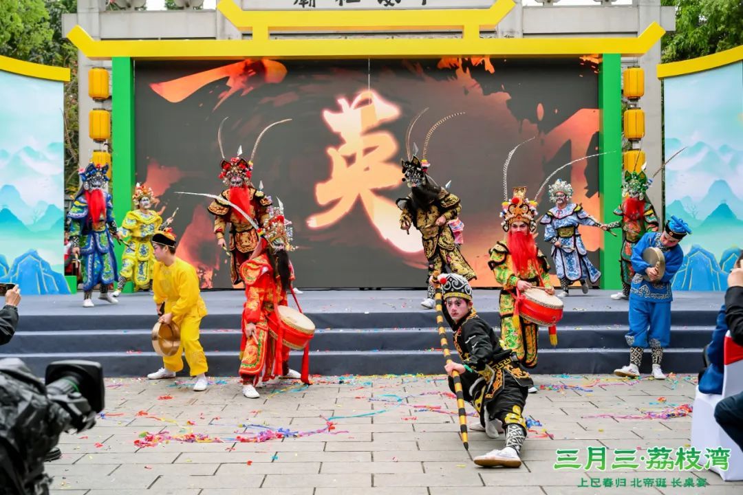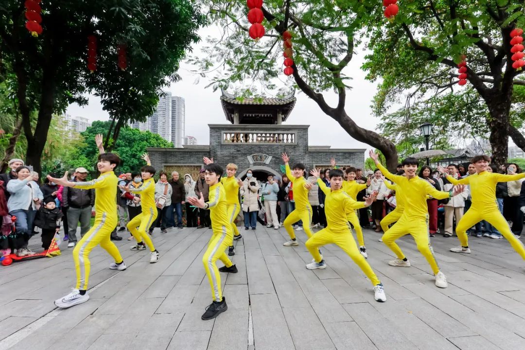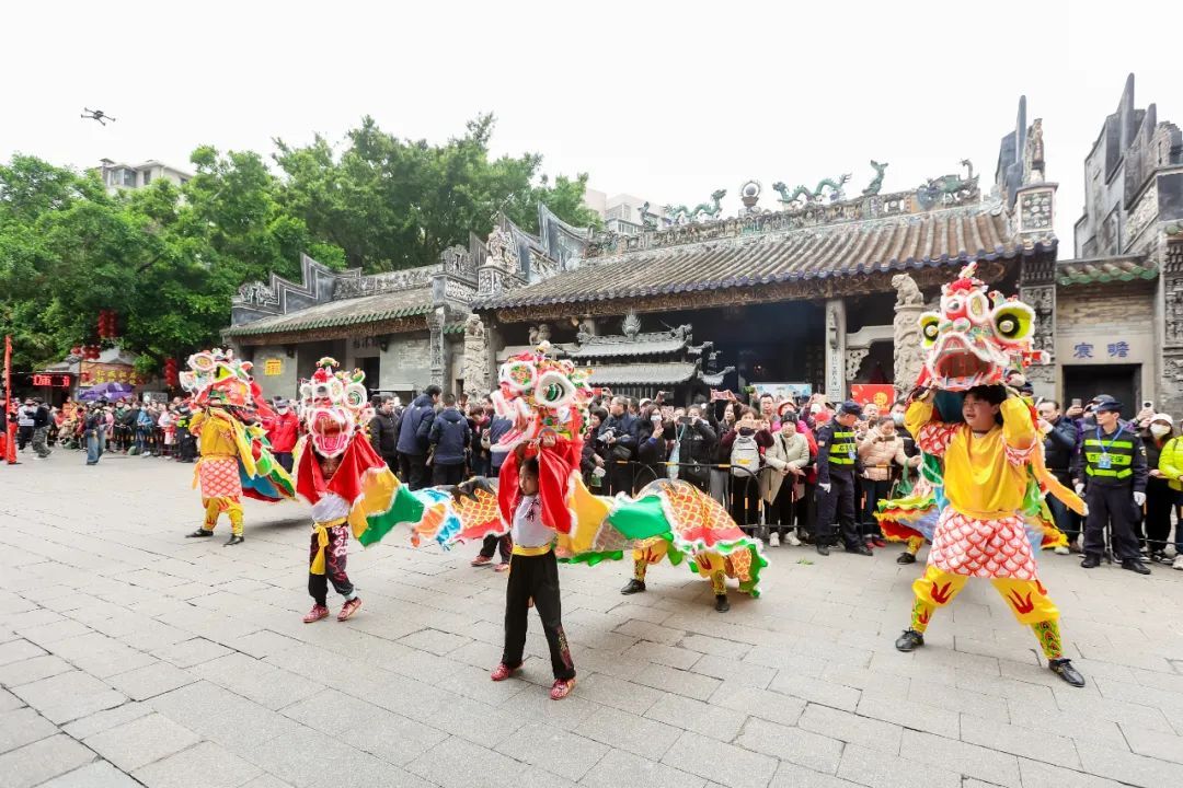 3月31日10时许,仁威庙牌坊广场上,三月三活动启动仪式盛大开启。龙狮献瑞闹西关,泮塘村龙狮队的精彩采高青表演为现场观众带来了极具西关民俗风情的开场表演。随后,来自中山的醉龙舞、潮汕的英歌舞,以及荔湾本土的精武西关,轮番登场献艺,以一段民俗串烧表演展现岭南文化的多元与活力。