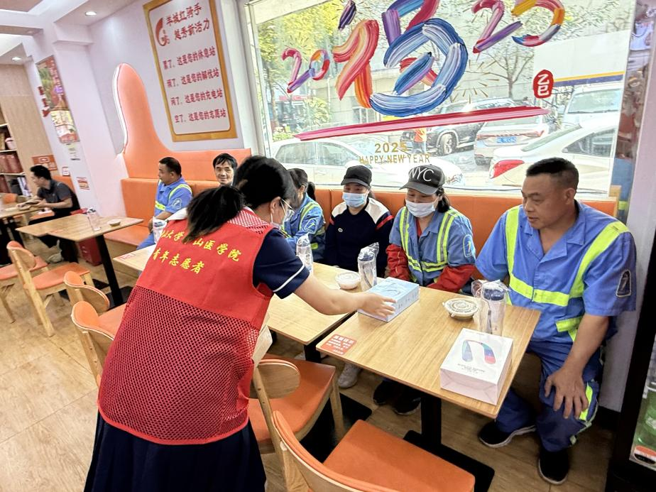 绿豆文火慢炖至绵软起沙,西米沸水翻滚成剔透“珠玉”……中山医学院的青年志愿者们分工合作,精心熬制传统广式绿豆汤与椰香西米露。待糖水冷却至适宜温度后,他们将糖水分装进环保餐盒,并递给现场的环卫工人和快递小哥等新就业群体,现场满是温暖的气息。