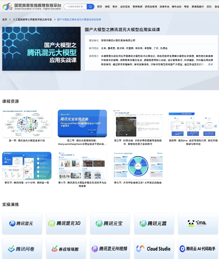 国家智慧教育平台建成三年来,已成为国内规模最大的智慧教育平台。在教育部高等教育司邀请下,腾讯结合自身大模型技术优势与全栈AI产品,从高校师生日常使用场景出发,设计制作了“腾讯混元大模型应用实战课”,上线国家智慧教育平台“人工智能教学服务开放应用专区”,和“高校学生就业能力提升‘双千’计划”专区。