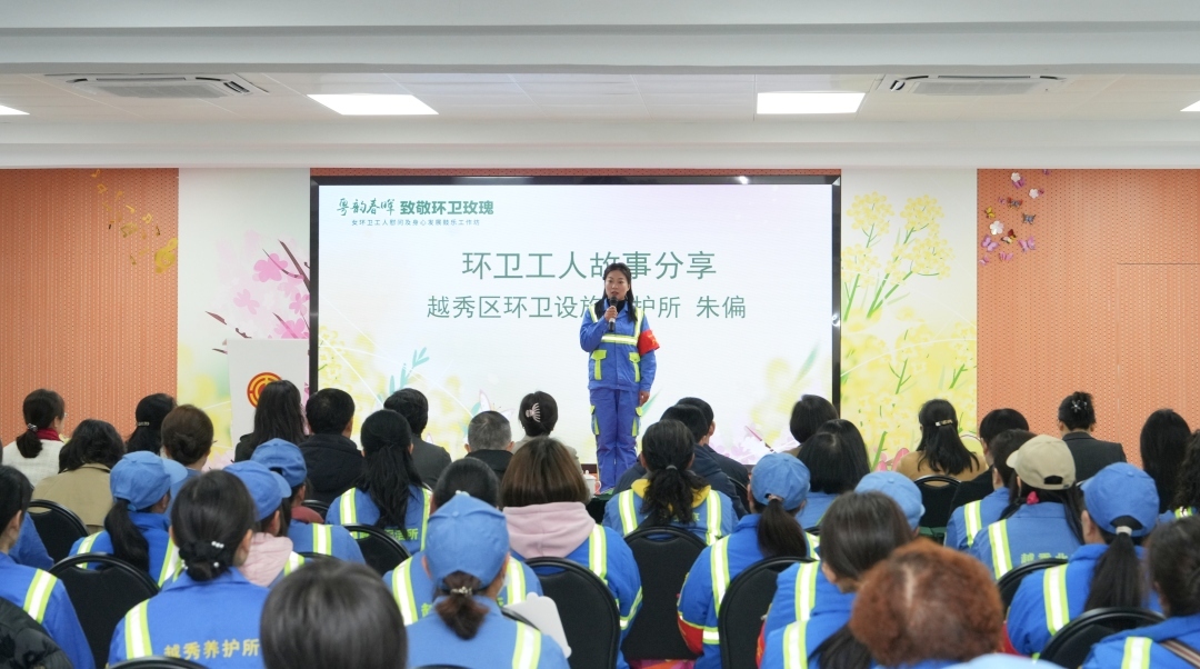 活动现场,深圳市达聆社工服务中心带来了一场专属的“心聆鼓乐工作坊”体验表演,引导环卫女工以“鼓乐”为媒,开启一场身心放松之旅。越秀区环卫设施养护所朱偏、徐红燕,越秀区市容环境卫生保洁所袁其兰、杨倩、孙治梅与大家分享了个人成长和工作故事。