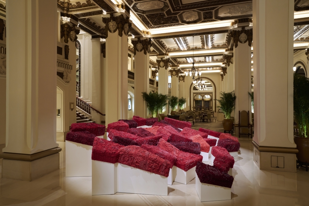 用数码方式印制在铝质面板上,透过数码方式将月球的零碎影像悬挂于酒店外墙;在酒店大堂茶座,一个鲜红色的大型艺术装置,以云南白族妇女世代相传的传统织品工艺打造,表达能量与情感、生命周期和爱……以“传统与创新的对话”为主题的2025年度“艺术回响”在香港半岛酒店登场,三位艺术家在酒店外墙、大堂茶座以及露台餐厅等不同区域打造大型创新艺术装置,展示当代艺术与传统文化的深度交融,游客在酒店就能完成一次沉浸式艺术之旅。