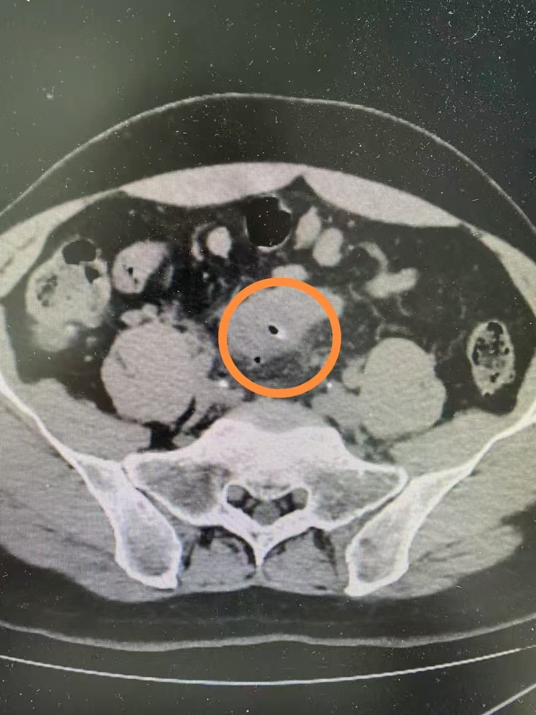 CT结果出来后,何医生发现枣核竟像钉子一样扎穿了肠子,情况十分危急。何医生马上向上级医师汇报,并请胃肠肛肠外科罗兵主治医师会诊。罗兵主治医师发现李奶奶下腹部压痛、反跳疼痛明显,且抽血提示白细胞升高明显,遂立即请示胃肠肛肠外科邱磊主任和魏君副主任医师。