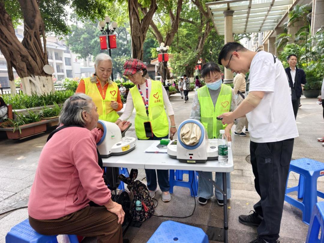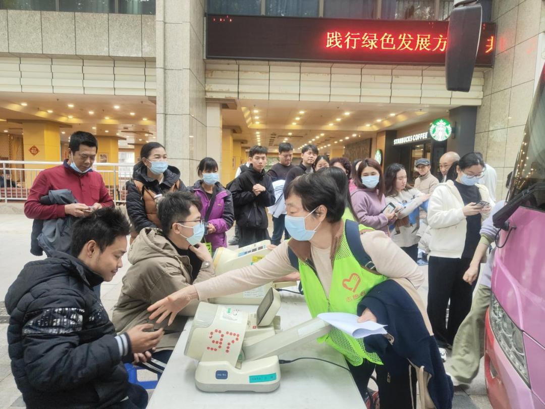 广州市第一人民医院仁心银龄志愿服务队队员参与流动献血车志愿服务。