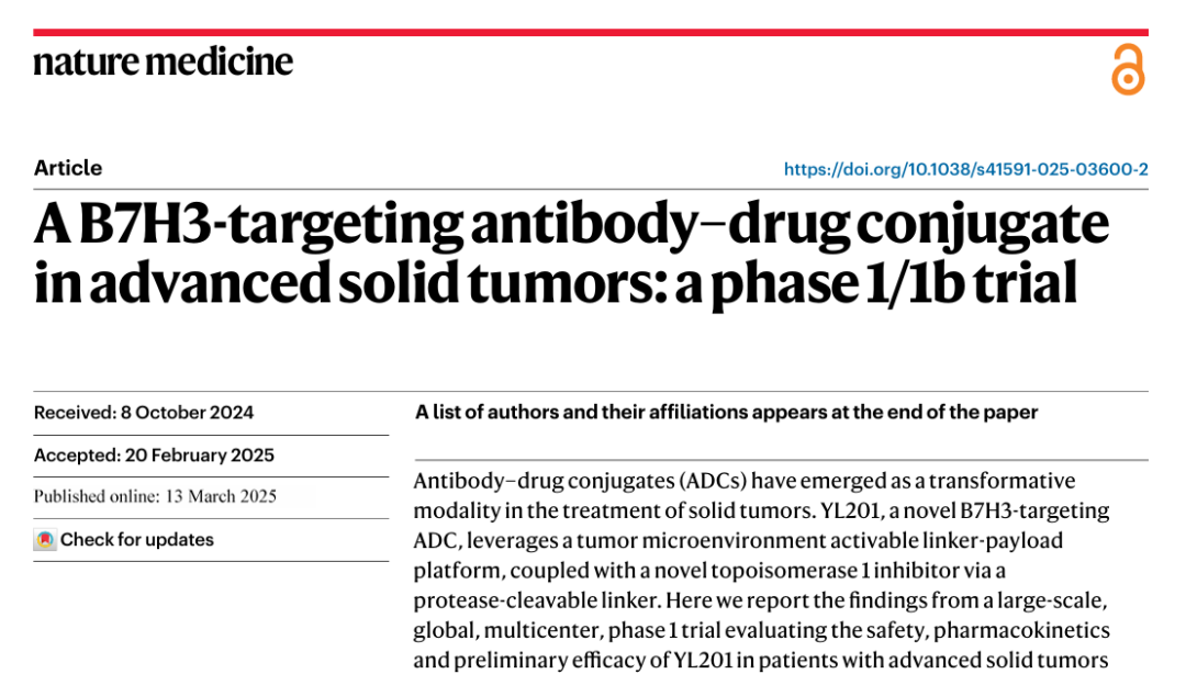 近日,中山大学肿瘤防治中心张力、赵洪云教授团队在国际顶级期刊《自然·医学》(Nature Medicine)发表了全球首个B7H3靶向ADC药物治疗晚期实体瘤的Ⅰ期临床研究重磅成果!