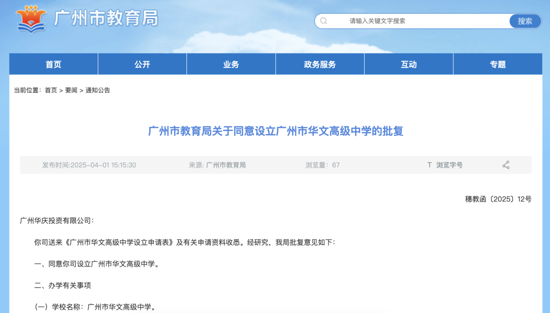 4月1日,广州市教育局官网发布关于同意设立广州市华文高级中学的批复和关于同意筹设广州市艺华高级中学有限公司的批复。