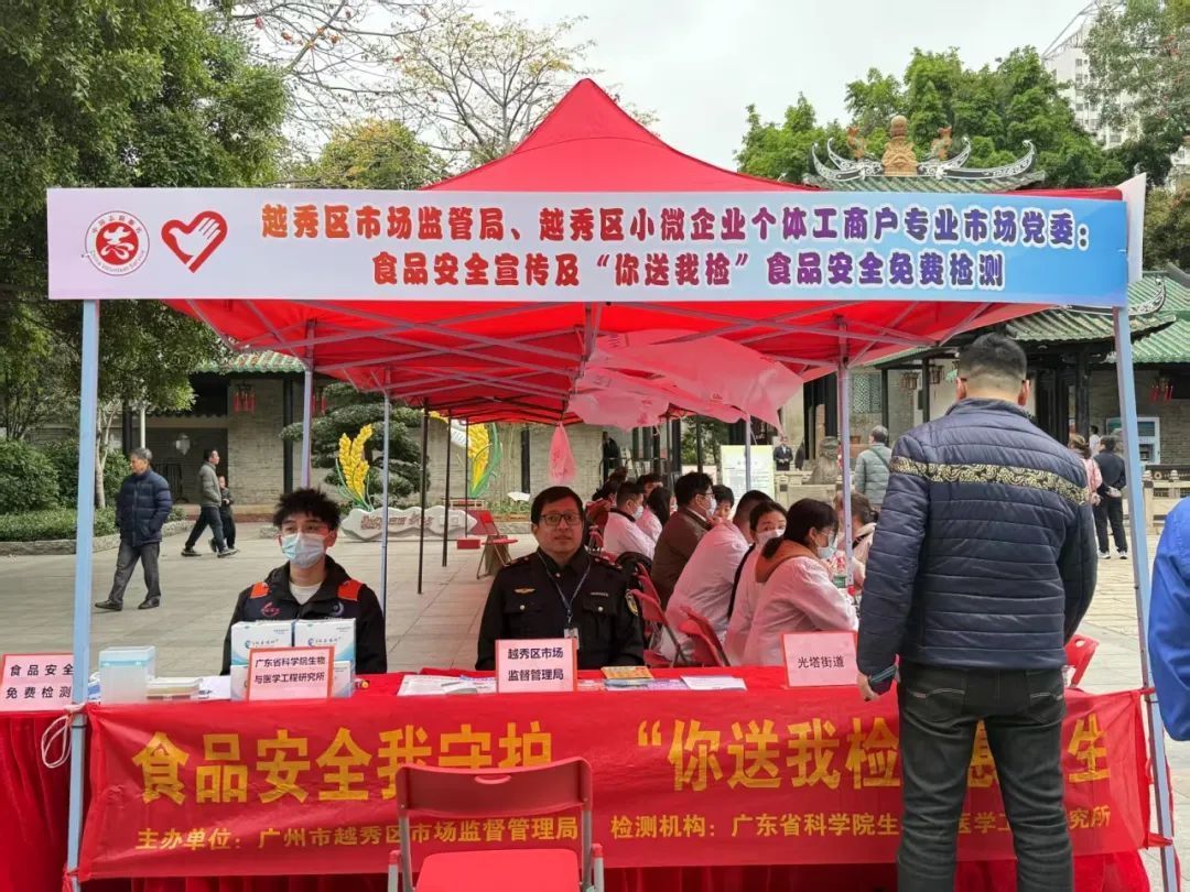 越秀区“小个专”党委、越秀区市场监管局设置宣传摊位,开展食品安全宣传和“你送我检”食品安全免费检测活动,进一步增强居民的食品安全意识。