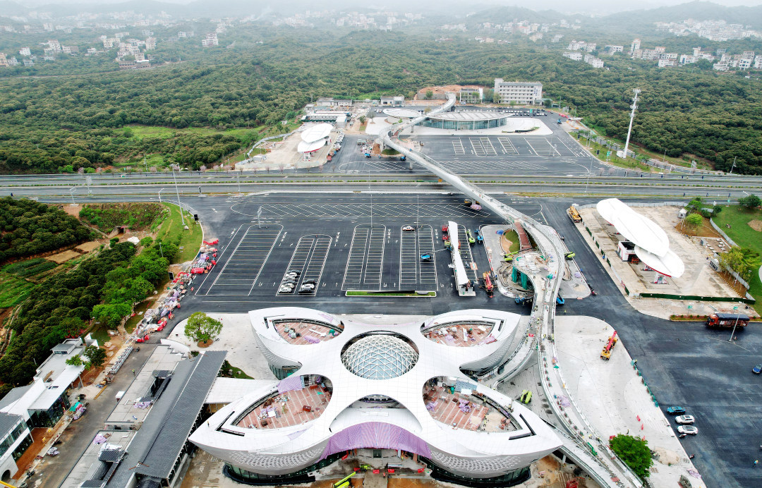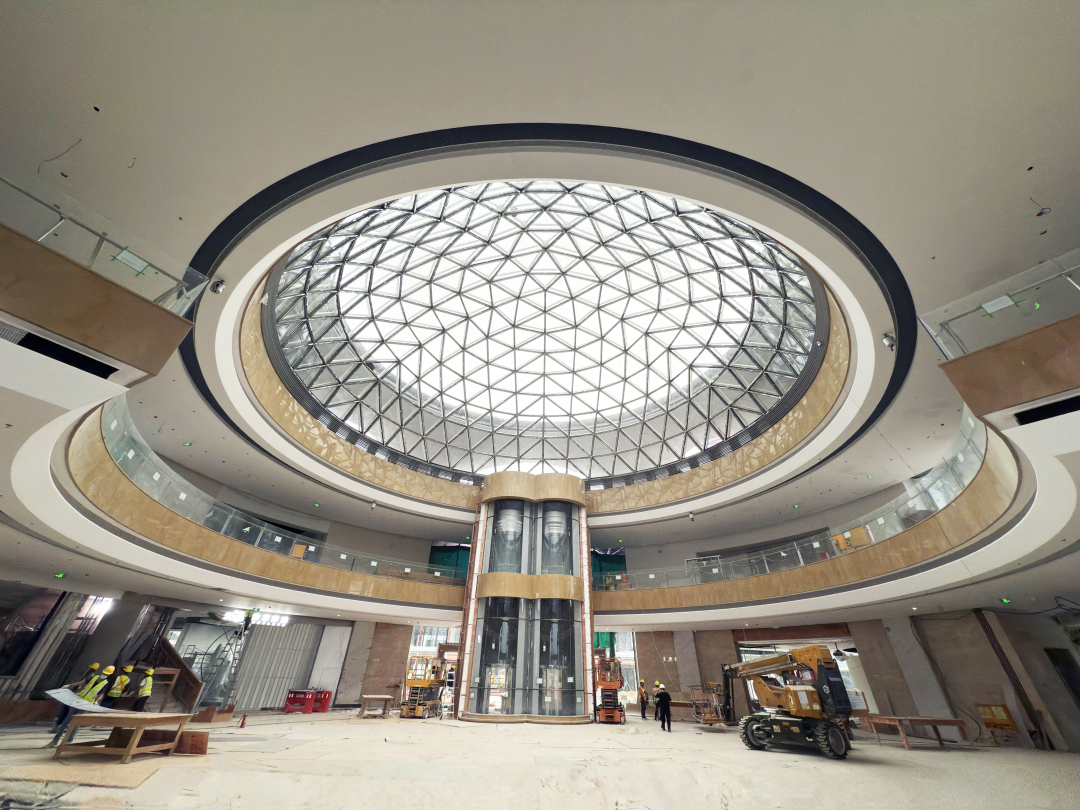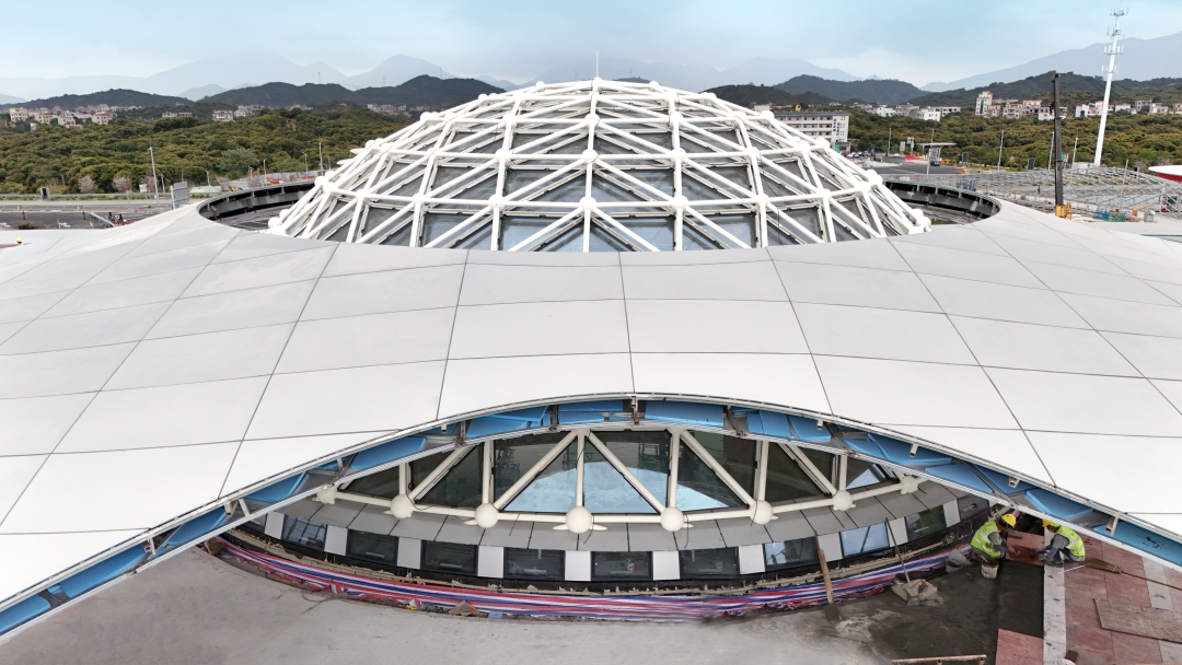 “西区服务楼以‘破壳荔果’为造型灵感,成为建筑最大亮点。”柏桥服务区项目负责人李军介绍,晶莹剔透的玻璃穹顶兼具荔枝果实的质感与现代建筑科技感,钢网架结构由276个球体、800余根杆件精密拼装而成,施工团队创新应用“短线施工法”,误差控制在毫米级。穹顶采用直径24米的曲面弯弧超白玻璃,透光率达90%以上,兼具隔热、抗冲击性能,内置智能温控系统,让游客四季尽享通透舒适的休憩空间。