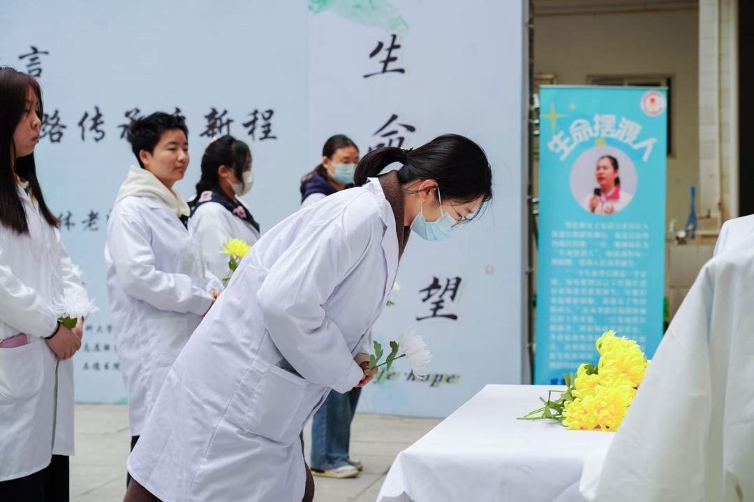 3月30日,广东医科大学湛江校区举行三场不同类别的追思活动。活动创新增设“生命教育长廊”,以图文影像全景式展现我国遗体捐献事业从筚路蓝缕到蓬勃发展的历程。解剖楼前,白菊与千纸鹤交织的献花台、写满感恩的留言墙,无声诉说着医学生对“无言良师”的崇敬。