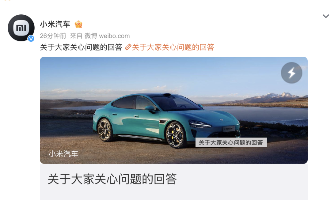 4月1日晚间,小米汽车通过微博官方账号,针对小米SU7高速事故中的六个问题进行了回应。