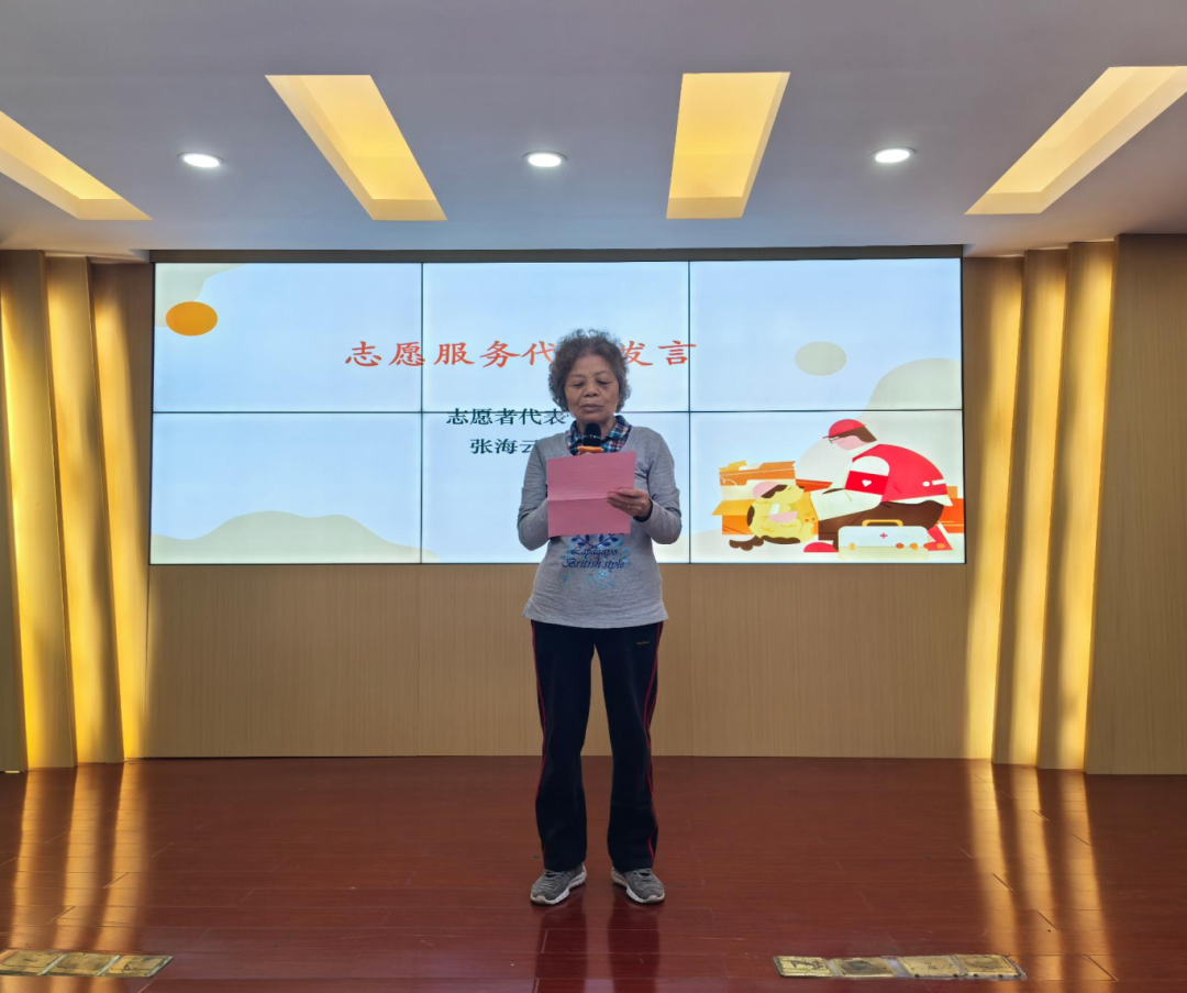 活动邀请了北京街2024年度志愿服务时长最长的志愿者张海云上台发言。张海云感慨道:“自从街道有了社工站,我就积极参与志愿服务,至今已12年有余。每参与一件社会公益相关的工作,我都由衷地感到开心。未来,我会在助人为乐的道路上持续前行,积极回报社会,为共建和谐社会贡献自己的力量。”