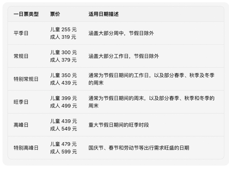 根据此次公布的票价,上海乐高乐园的票价根据入园日期的不同,分为平季日、常规日、特别常规日、旺季日、高峰日、特别高峰日六档,成人票价最低319元、最高599元,儿童票价最低255元、最高479元。