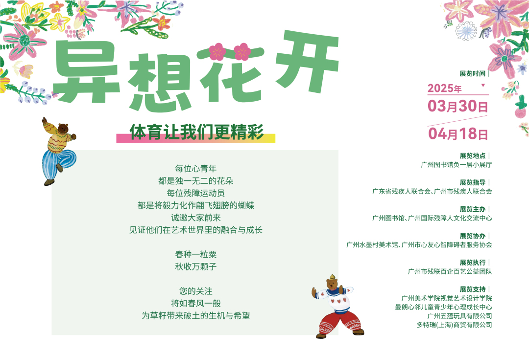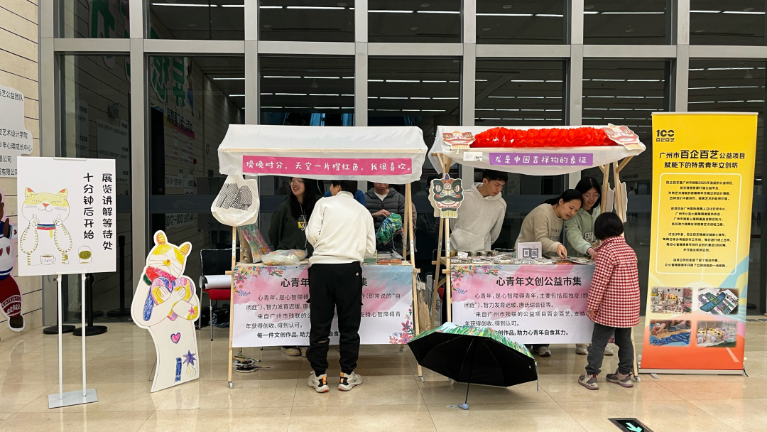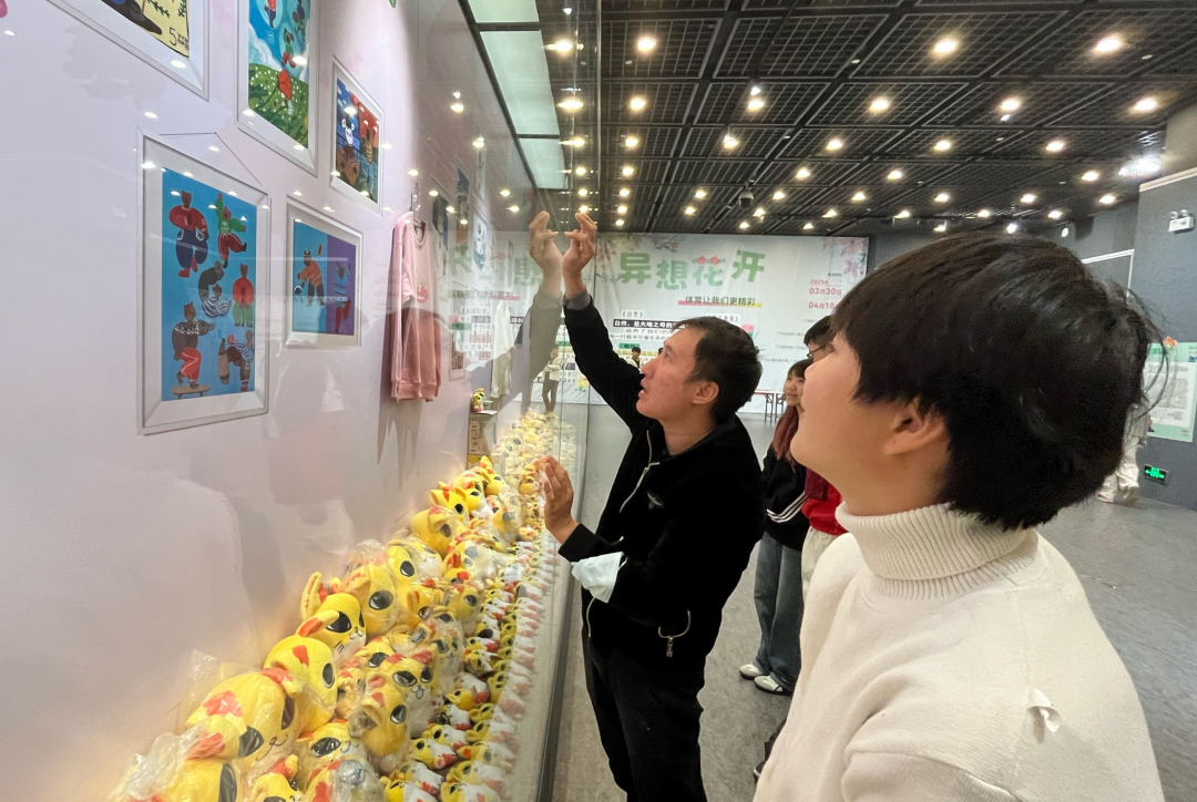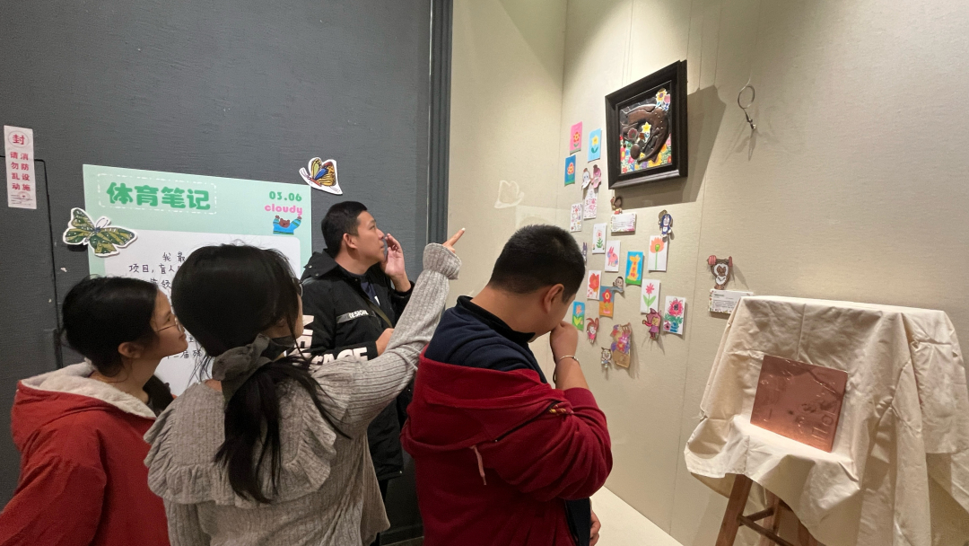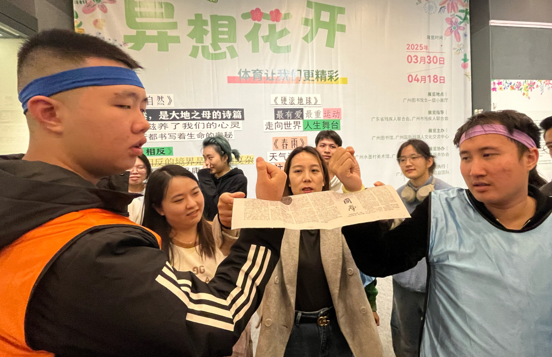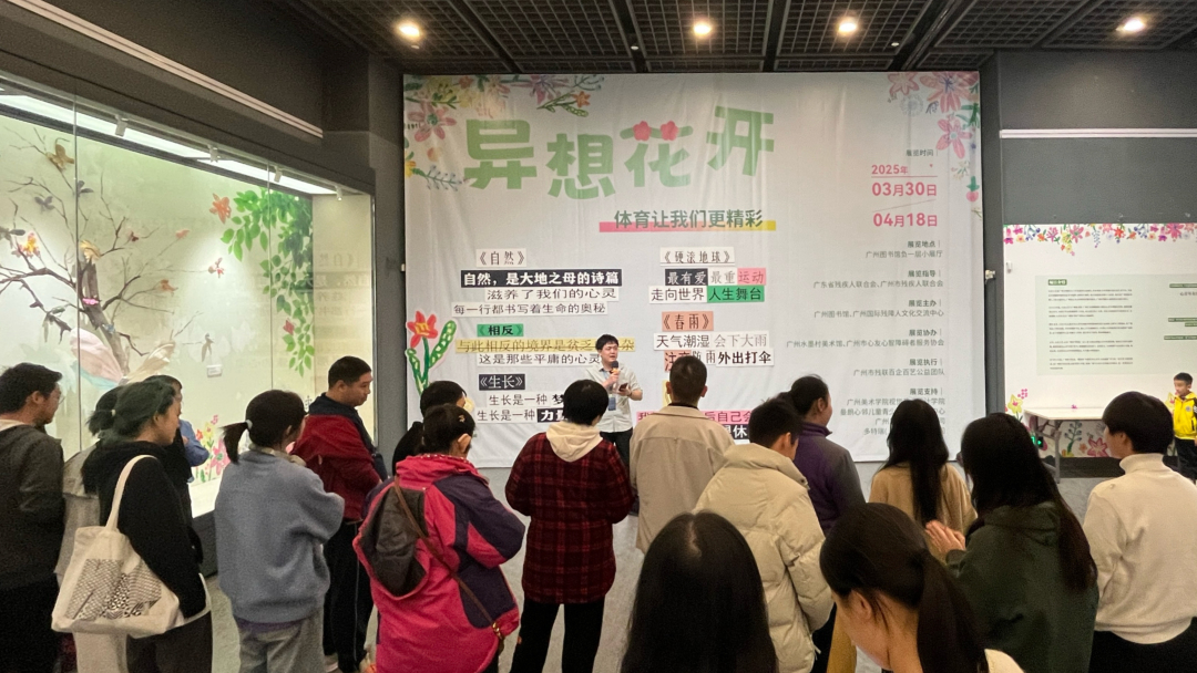 2025年3月30日,一场体育与艺术相融合的名为“异想花开:体育让我们更精彩”的特展在广州图书馆负一层拉开序幕。当观众鱼贯而入欣赏着作品的同时,不断发出赞扬的感叹:“哇,他们用报纸做蝴蝶,好漂亮啊”“那个青蛙眼罩好可爱”“这些画画的比我们还要好”......在展厅外,心青年羲仔正在激动地为大家介绍他与同学的绘画创作而成的文创产品。