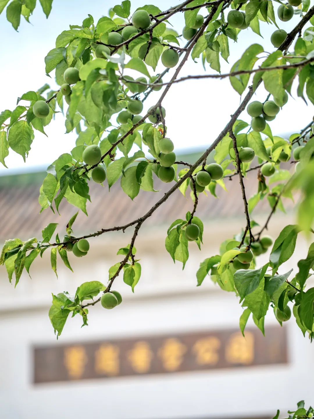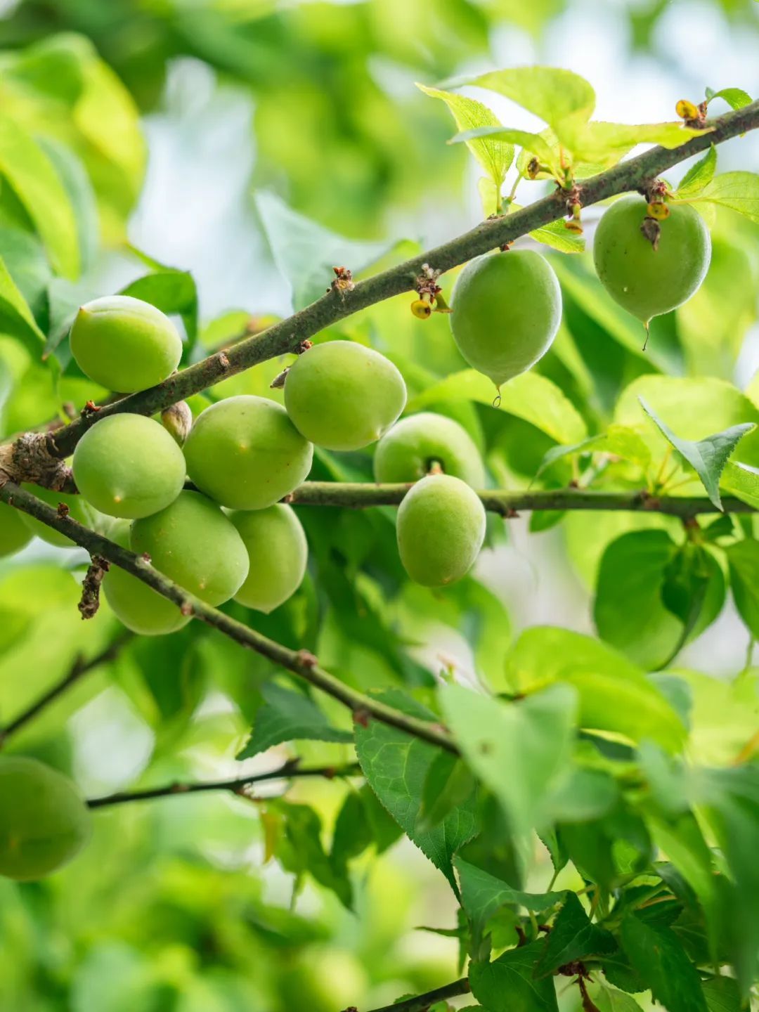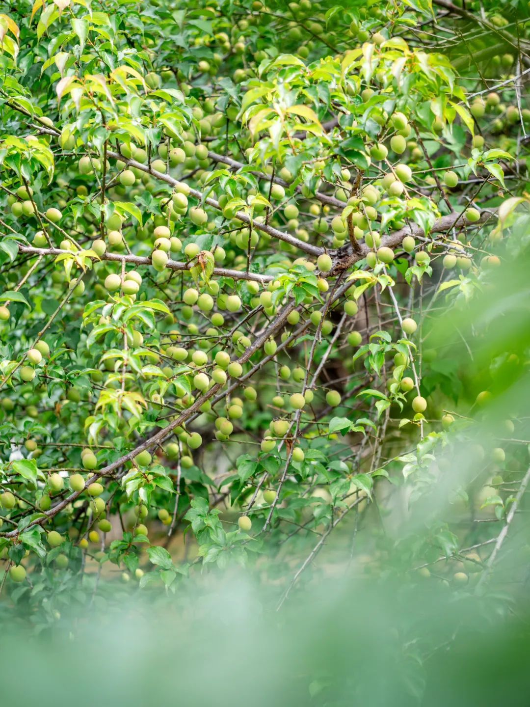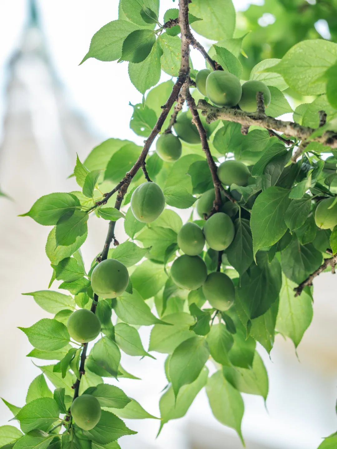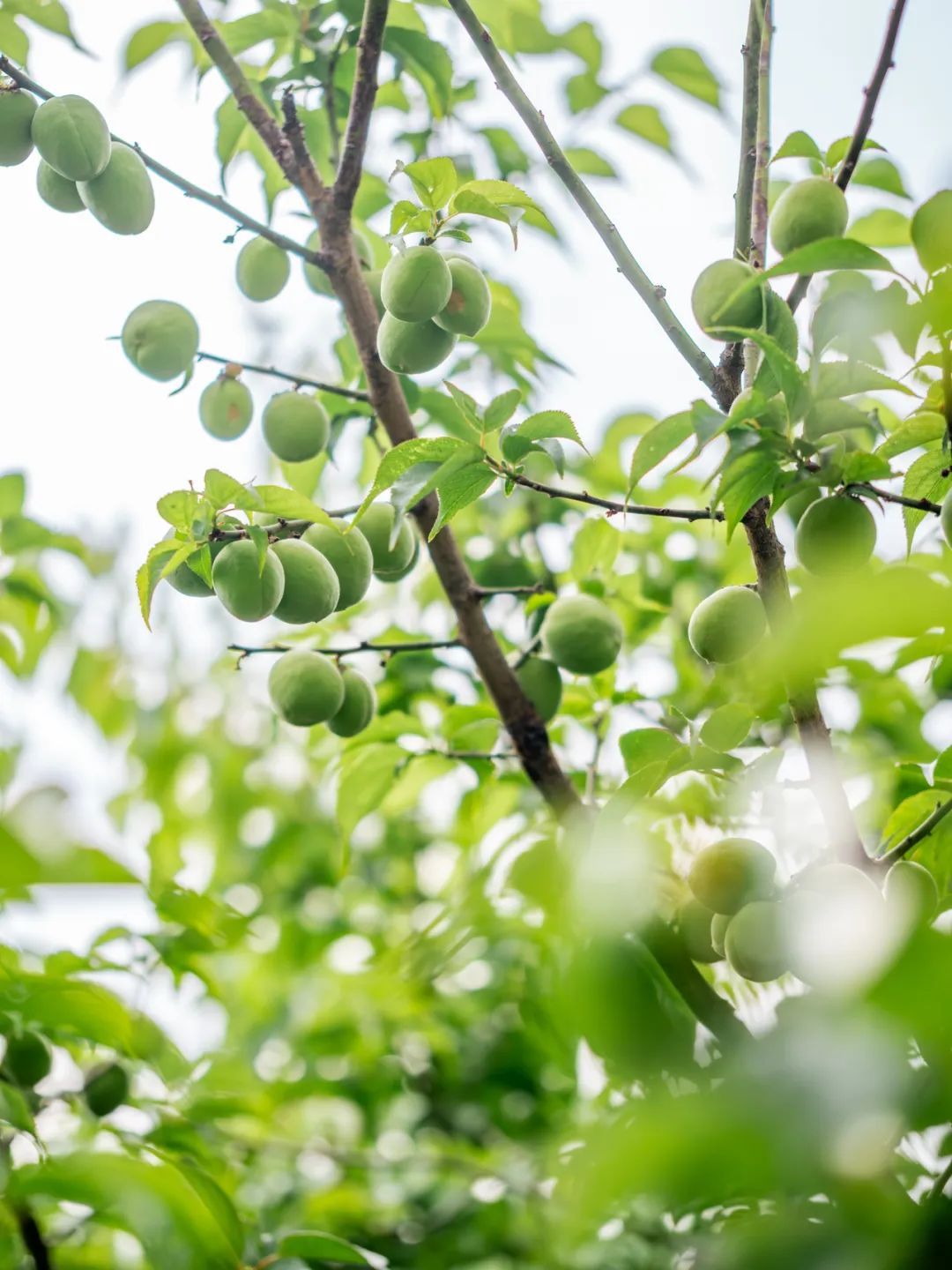 青梅果圆鼓鼓的,翠绿中透着青涩,与满眼新绿的梅树叶子构成十分清新美好的画面,赏心悦目。